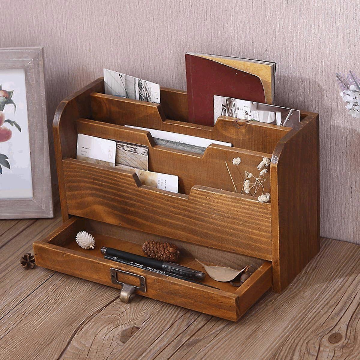 3 Tier Wooden Letter Holder Mail Sorter Letter Rack with Drawer Desktop Organiser Document File Storage Stand