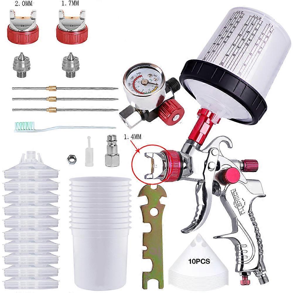 [DETAIL]<br>Features:<br>- This professional HVLP paint spray gun, with even spraying and fine atomization, ensures that the color reaches every corner when spraying, and is suitable for car spraying, furniture spraying, handicraft spraying, wall spraying and other paint spraying.<br>- With 1.4/1.7/2.0/2.5 mm nozzles (Depends on the package you choose) and easily adjustable spray width and flow, this spray gun paint sprayer can meet your needs for different spray surfaces<br>- The spray paint gun body uses forging process, wear-resistant and anti-oxidation, lasting as new. The nozzle is made of stainless steel, with many paint holes and fine atomization, which is perfect for car painting, furniture modification, industry, etc. Brass wind cap protects the gun needle from lacquer mist pollution.<br>- We aim to solve every customer's problems. If you have any other problems after receiving the goods, please contact us in time!<br>Complete Set A:<br><br>●1 x 1.4mm spray gun<br><br>●1 x 1.7mm Nozzle and Needle<br><br>●1 x 2.0mm Nozzle and Needle<br><br>●1 x Brush<br><br>●1 x Wrench<br><br>●1 x Pagoda connector<br><br>●1 x Filter<br><br>●1 x Screw<br><br>●1 x Pressure regulator<br>●10x Paper funnel<br><br>[ATTRIBUTES]<br>- Battery Included: No<br>- High-concerned chemical: None<br>- Origin: Mainland China<br>- Battery Included: No<br>- High-concerned chemical: None<br>- Origin: Mainland China