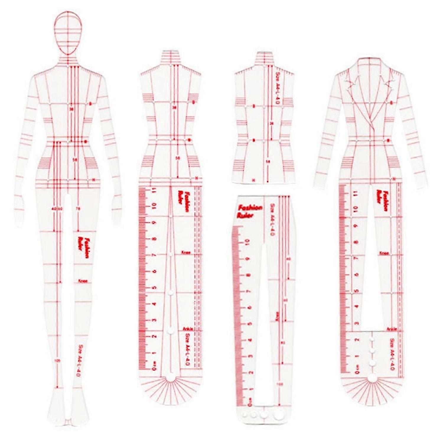 5-Piece Fashion Illustration Rulers Set Sketching Templates - Humanoid Design Patterns, French Curve & A4 Clothing Drafting Tools for Sewing