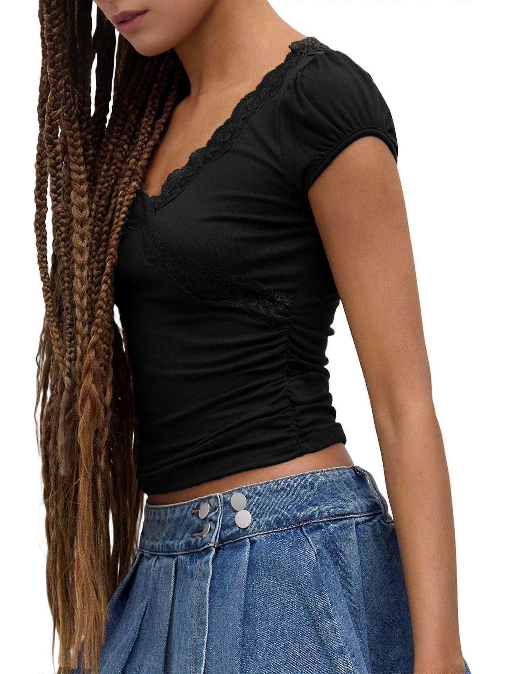 Lace Tops for Women V Neck Slim Fit Ruched Short Sleeve Elegant Solid Basic Tops Black L