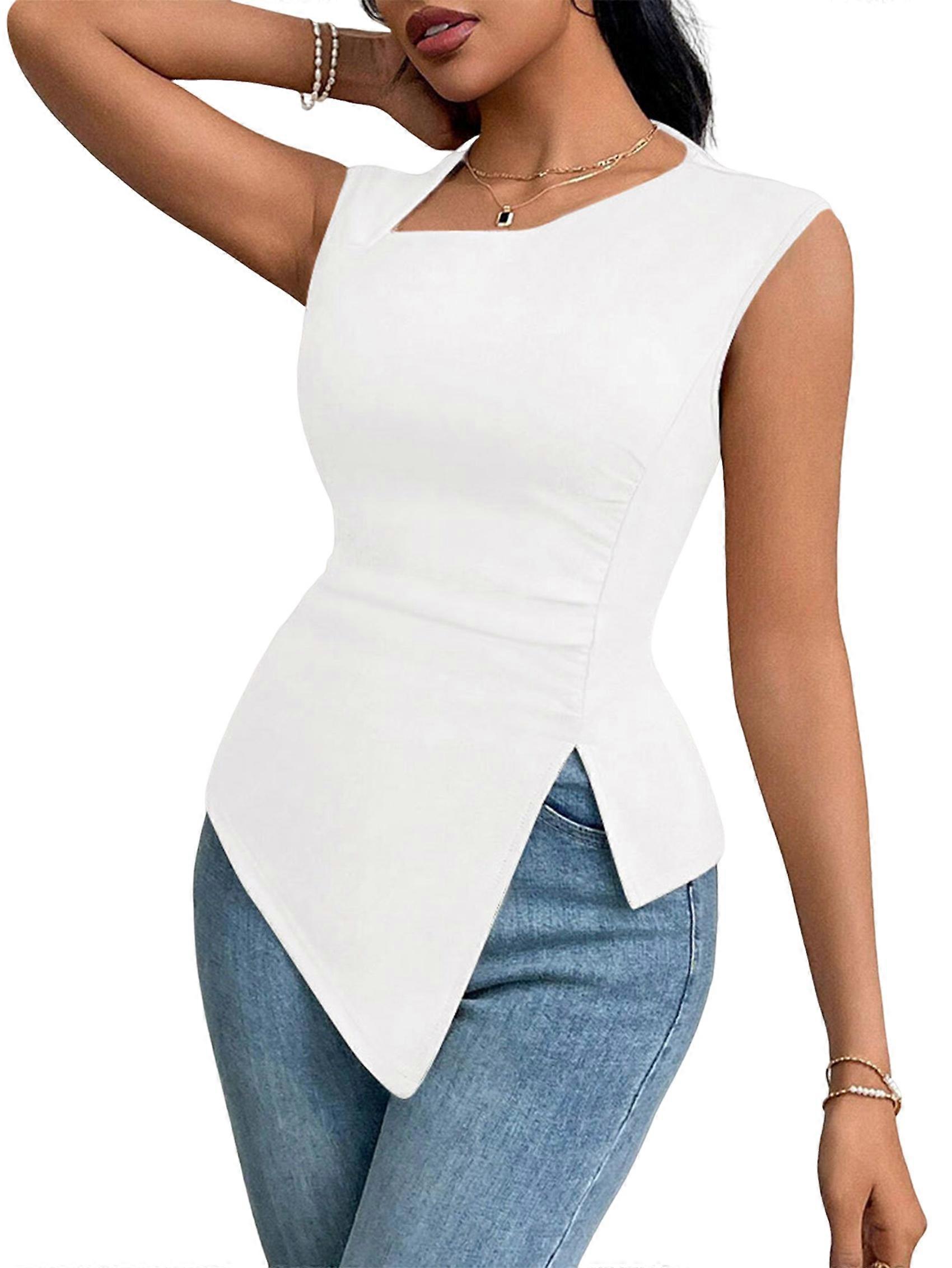 Womens Asymmetric Neck Slim Fit Cropped Solid Color Tshirt Elegant Basic Top Casual Chic Tee Cream White S
