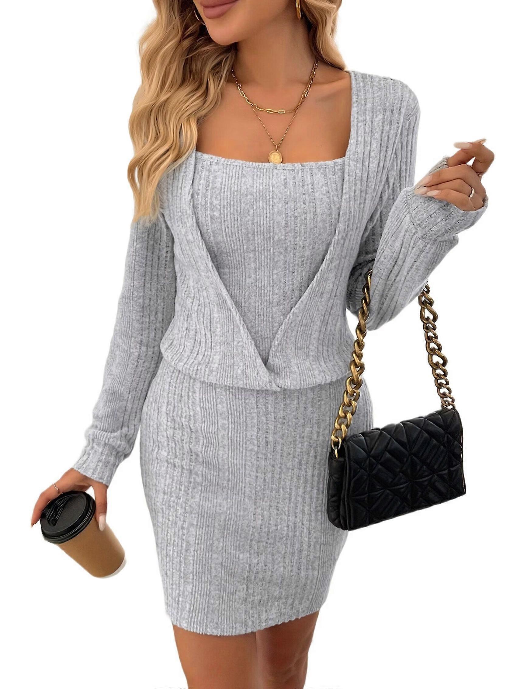 Made from 95% Polyester and 5% Spandex, this dress offers a medium stretch and a soft, ribbed texture. The quality knit fabric ensures both comfort and a graceful drape, making it ideal for cooler seasons. Featuring long sleeves and an elegant V-neck, this pullover sweater dress combines a flattering silhouette with a stretchy ribbed structure. It is designed to enhance your natural figure while providing all-day ease. Versatile for styling-wear it with knee-high boots and a statement belt for a polished look, or pair it with sneakers and a denim jacket for a casual vibe. Layer with a long coat when the temperature drops. Perfect for a variety of occasions, from casual outings, office wear, and holiday parties to evening events. Its adaptable design makes it a go-to piece for the modern woman's wardrobe. Size: L=US8=UK12=EU40(cm / inch) Bust: 101.0 / 39.76, Skirt Length: 92.0 / 36.22 Colour: Light Gray Material: 95% Polyester, 5% Spandex Package Contents: 1 * Women's Long Sleeve Knit Slip Dress Only the above package content, other products are not included. Note: Light reflection and different displays may cause the color of the item in the picture a little different from the real thing. The measurement allowed error is +/- 1-3cm.