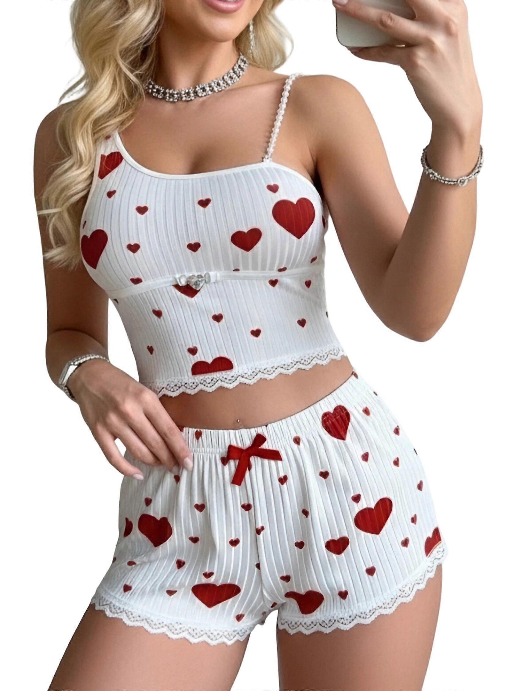 Women Pajamas Heart Print PJ Set Crop Tops and Shorts Set 2 Piece Lounge Sets Red M