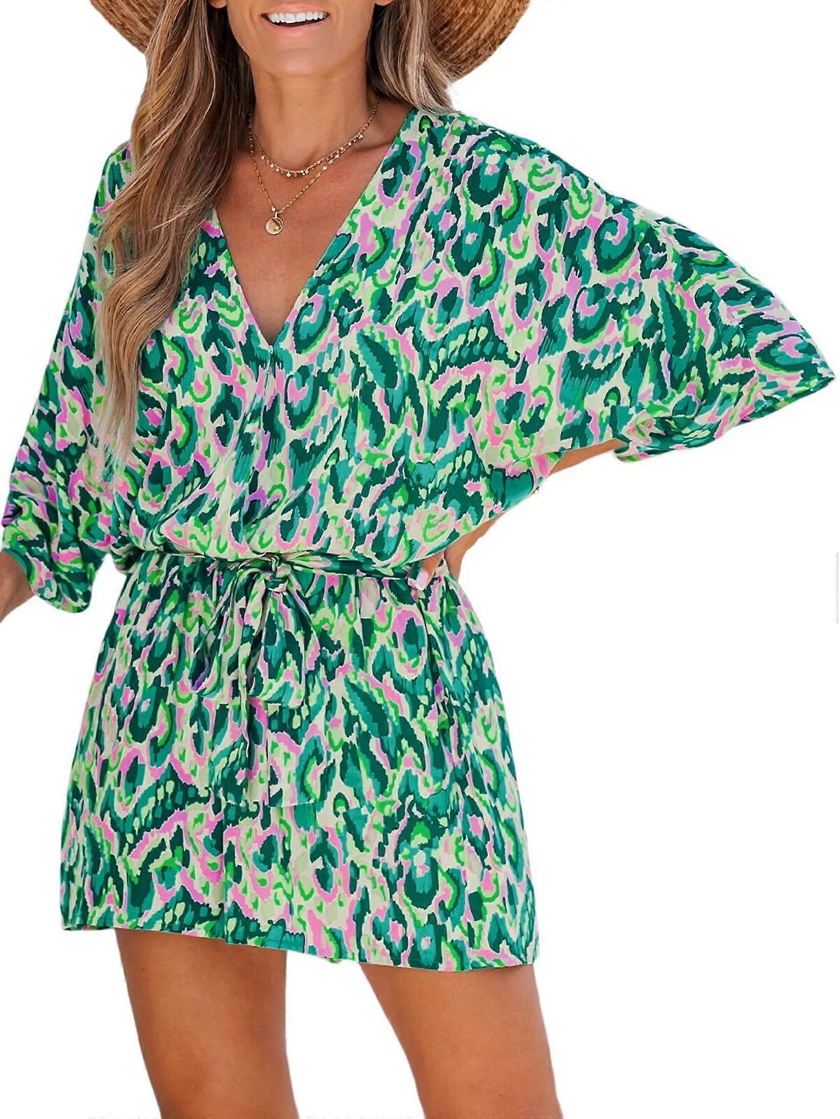 Women'S Summer Romper Lace Up Printed Half Sleeves Casual Wide Leg Mini One-Piece Jumpsuit Green L