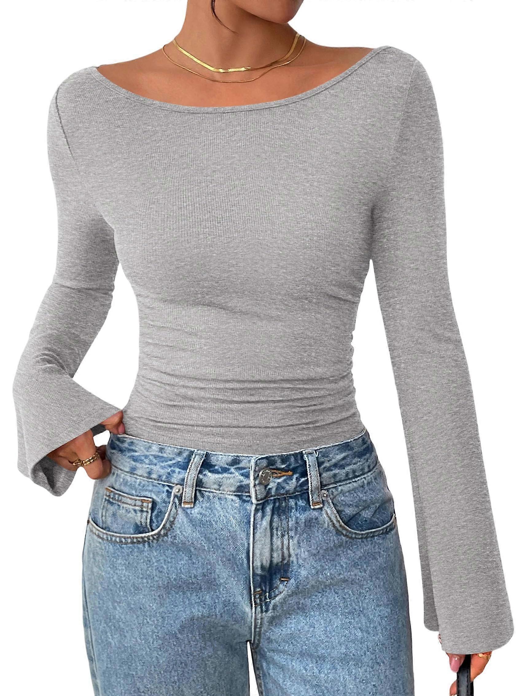 Women'S Long Sleeve Shirts Crop Going Out Tops Casual Boat Neck Bell Sleeve Ruched Light Gray S