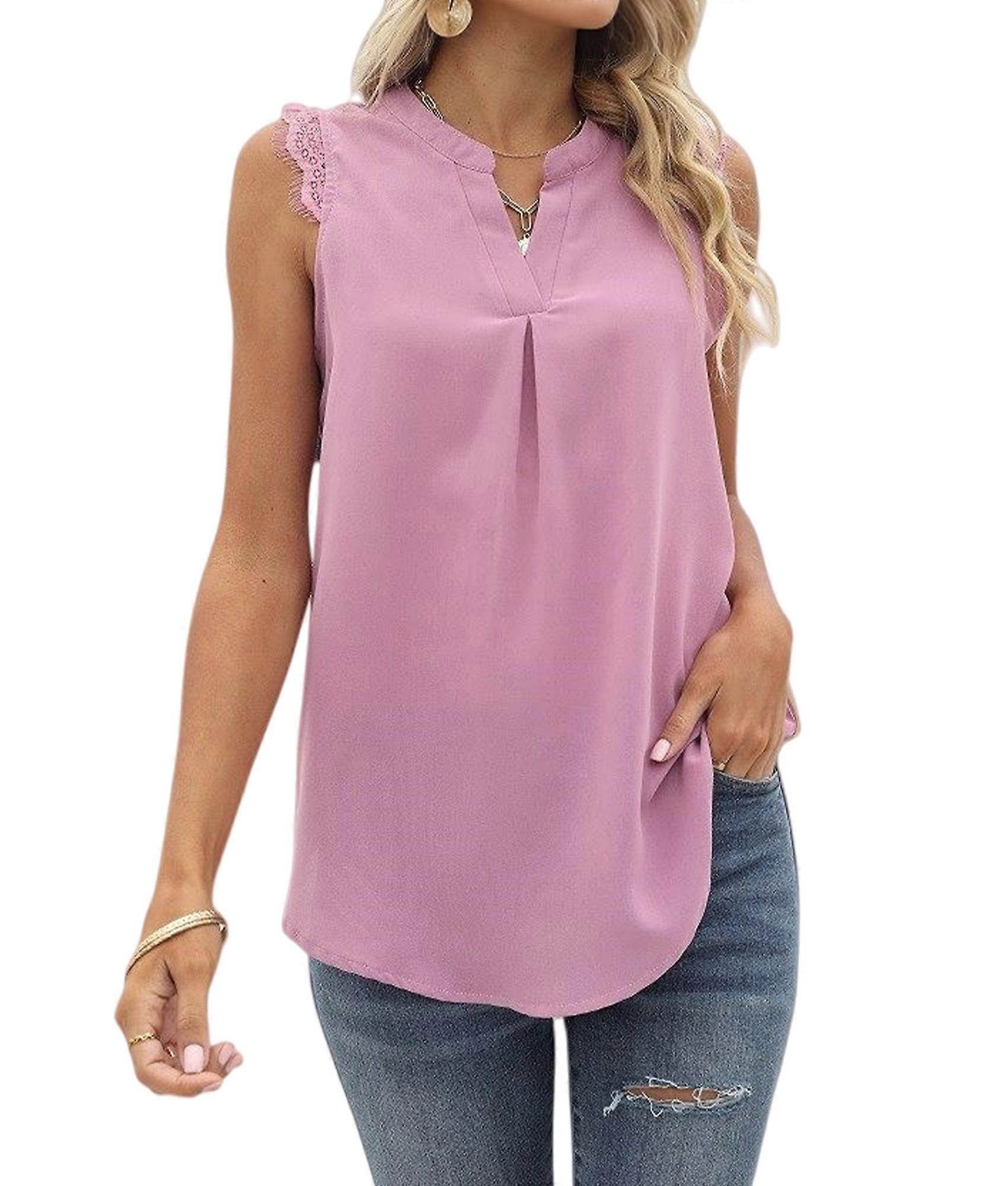 Women'S Summer Casual Sleeveless V Neck Lace Trim Tank Tops Loose Blouse Tees Pink XXL