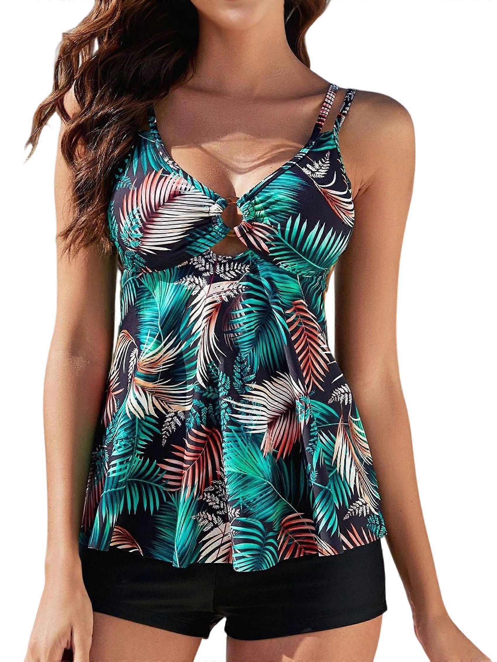 Women Tummy Control Swimsuit Modest Tankini Top with Boyshort Bathing Suits Swimwear Leaves XL