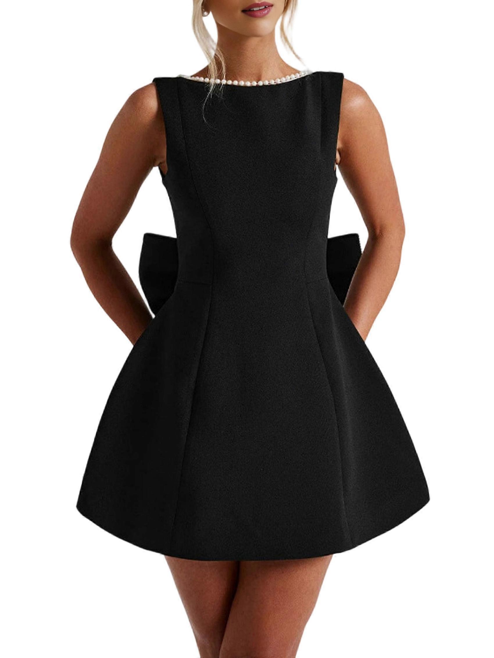 Women'S Summer Strapless A-Line Sleeveless Mini Dress Off the Shoulder Backless Cute Pearl Dress Black M