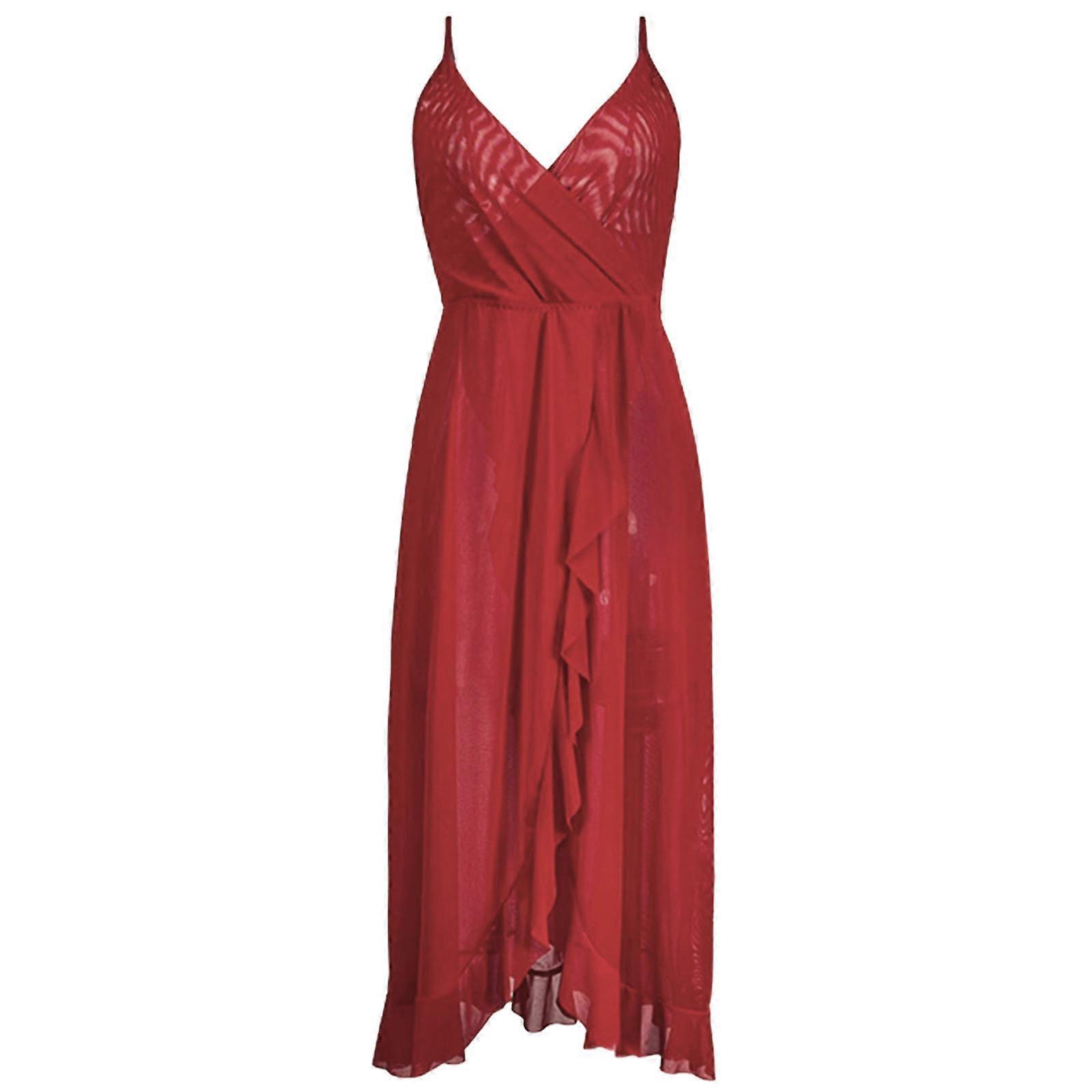 Women Comfortable V Neck Backless Sleeveless Spaghetti Strap Sleep Dress Nightgown With Soft Mesh Fabric For Home Wear Claret S