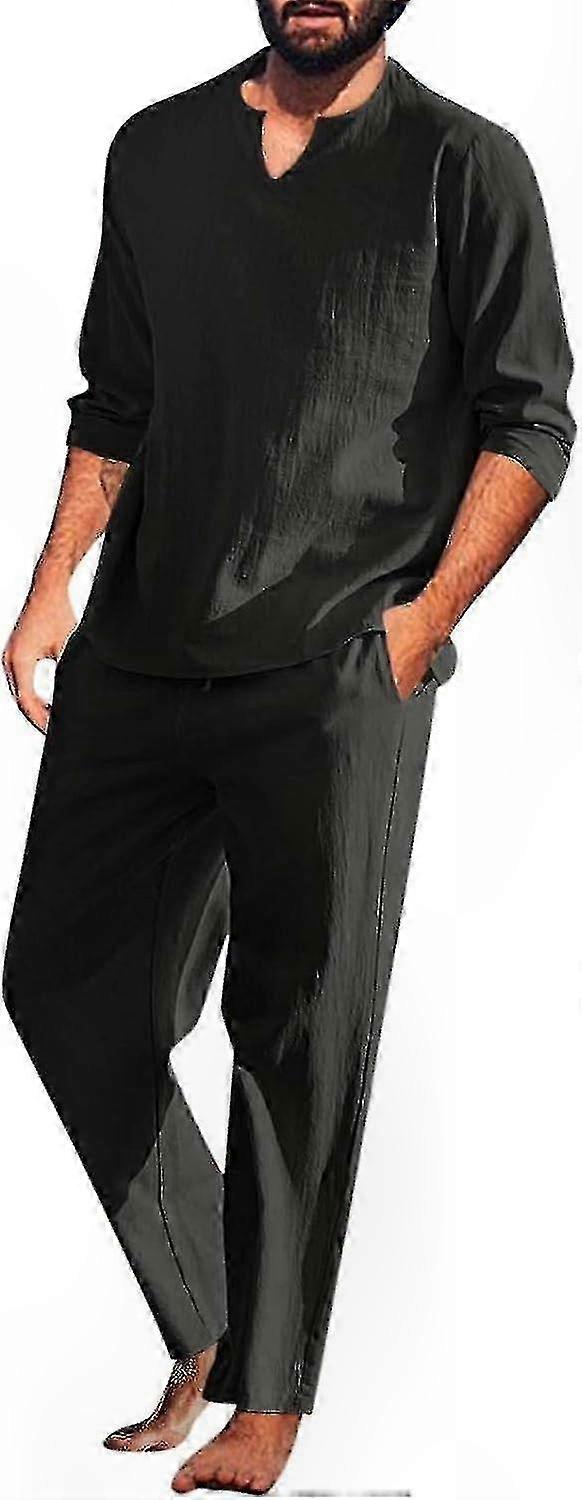 Men's Linen 2-Piece Sets Summer Long Sleeve Tee and Pants Casual Soft Sleepwear Loungewear Comfy Loose Outfits