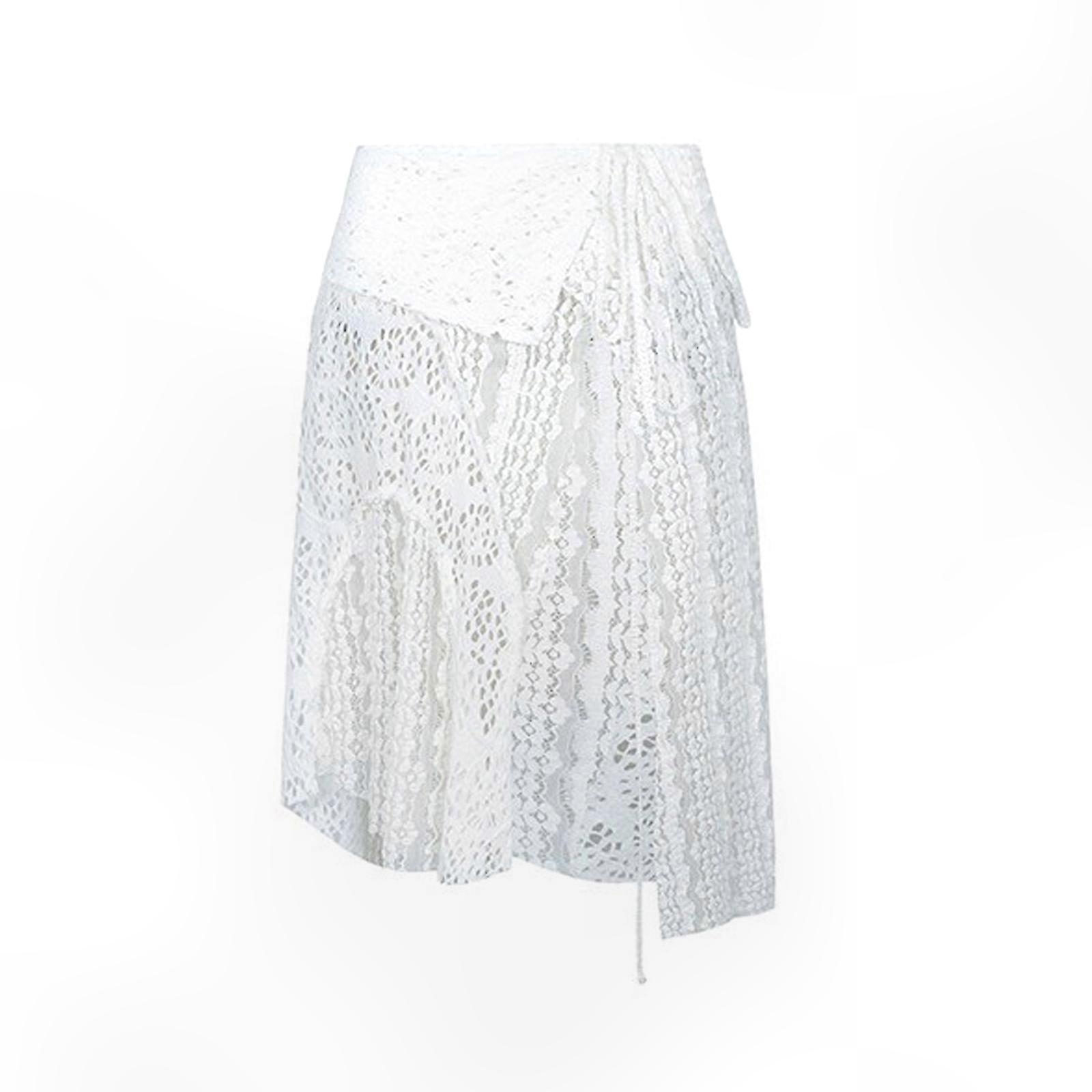 Women's Elegant Lace Apron Skirt with Asymmetrical Design, Layered Midi Length Overskirt, Adjustable Lace-Up Hip Scarf in White