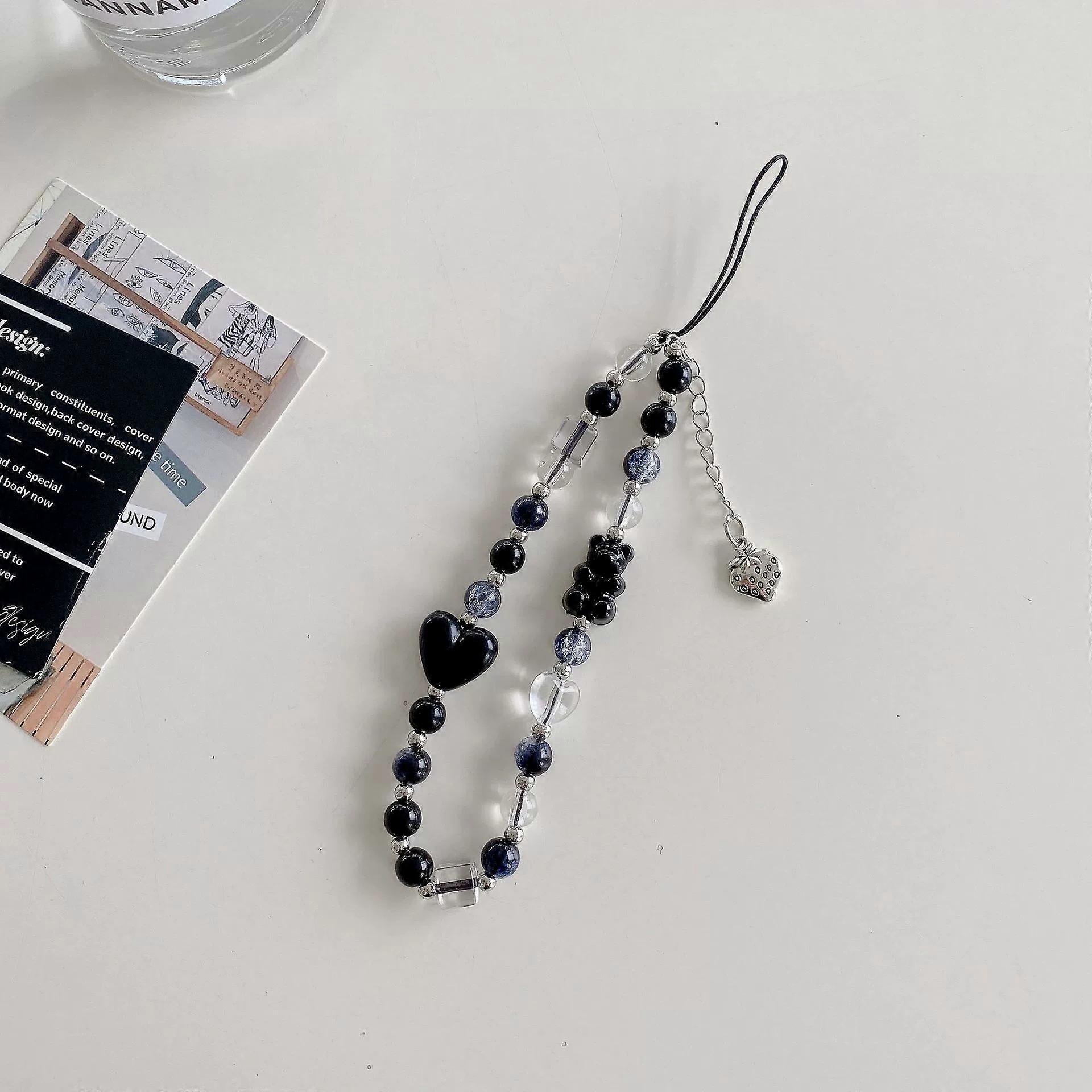 Black Beaded Mobile Phone Charm Ins Stringed Pearls Love Phone Lanyard Short Carrying Strap Drop-Resistant Phone Ornaments 2025