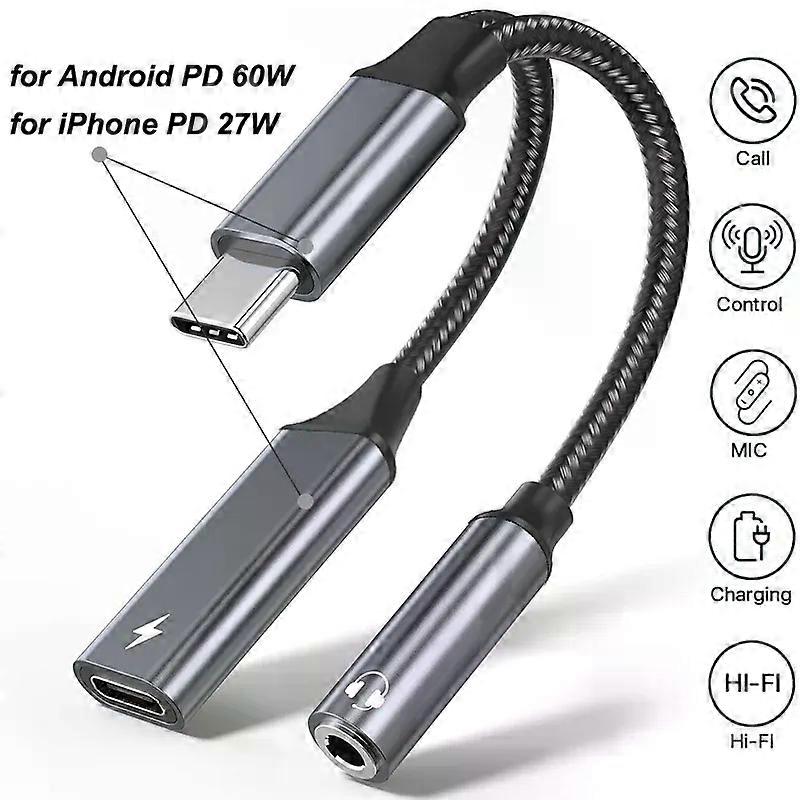 2 in 1 USB C Splitter to 35mm Headphone Jack and Charger Adapter PD 60W Fast Charging Audio Dongle for iPhone 15/16 Samsung Xia