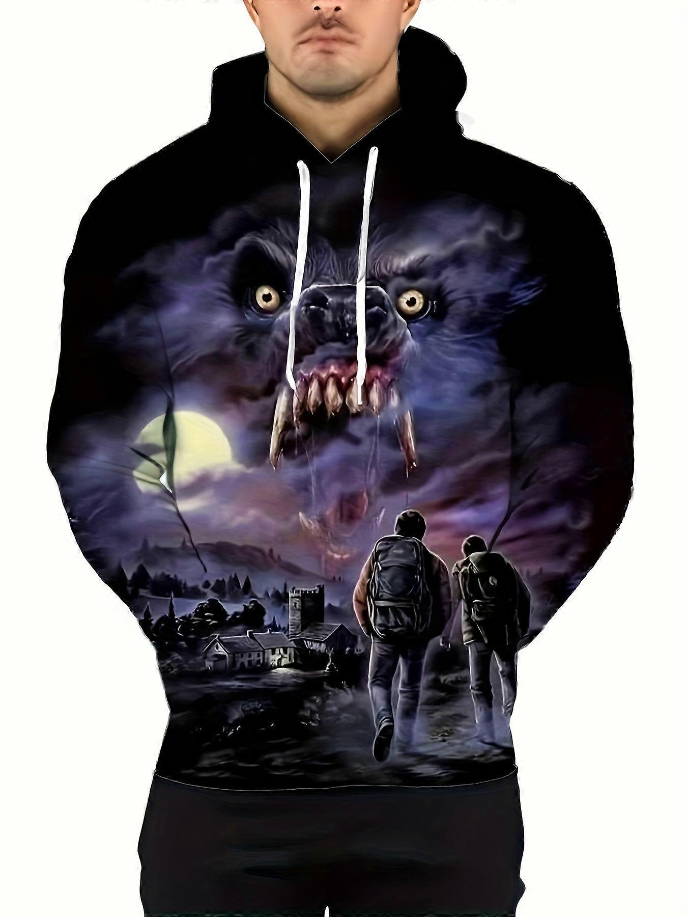 Men’s Spooky Graphic Hoodie Werewolf Moon Scene Print Casual Streetwear Pullover