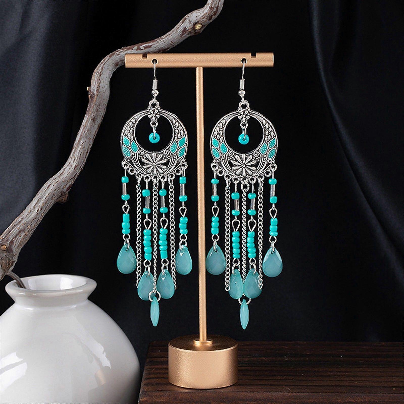 Bohemian Long Crystal Tassel Earrings for Women, Retro Ethnic Style Drop Design, Hypoallergenic Summer Vacation, 3 Pairs