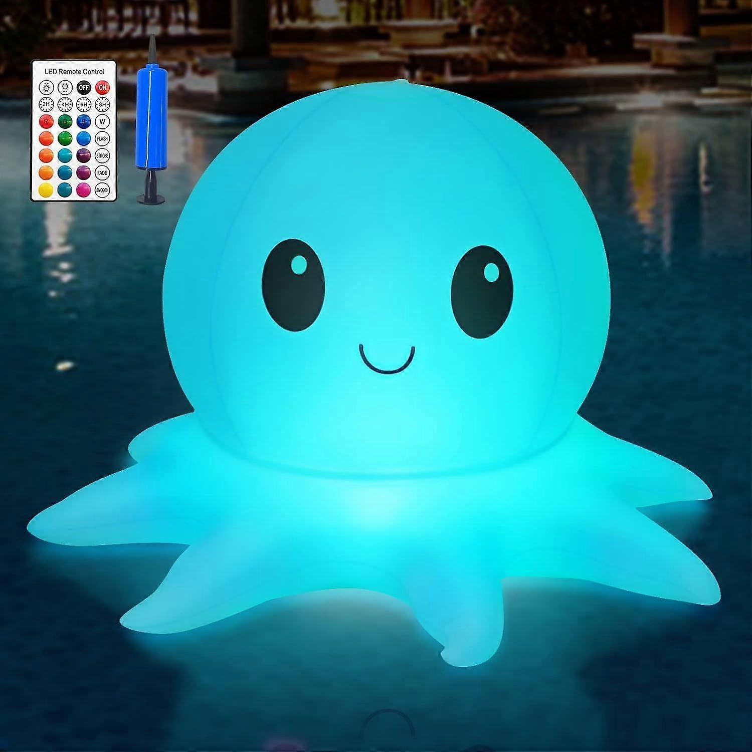 Fun Octopus Design:This adorable floating pool light features a cute octopus shape that adds playful charm to your pool, garden or outdoor parties while providing beautiful illumination. Solar Powered Convenience:Charges automatically by sunlight during the day and lights up automatically at night, providing eco-friendly lighting without wiring or electricity costs. Remote Control & Customizable:Easily adjust colors, brightness levels and set timer via included remote for perfect ambiance control. Premium Floating Light:Waterproof construction with stable floating base stays upright in water, creating magical reflections for pool parties, hot tubs or garden ponds. Versatile Outdoor Decor:Perfect for summer parties, backyard gatherings, or creating romantic atmosphere - great for pools, fountains, ponds and other water features.