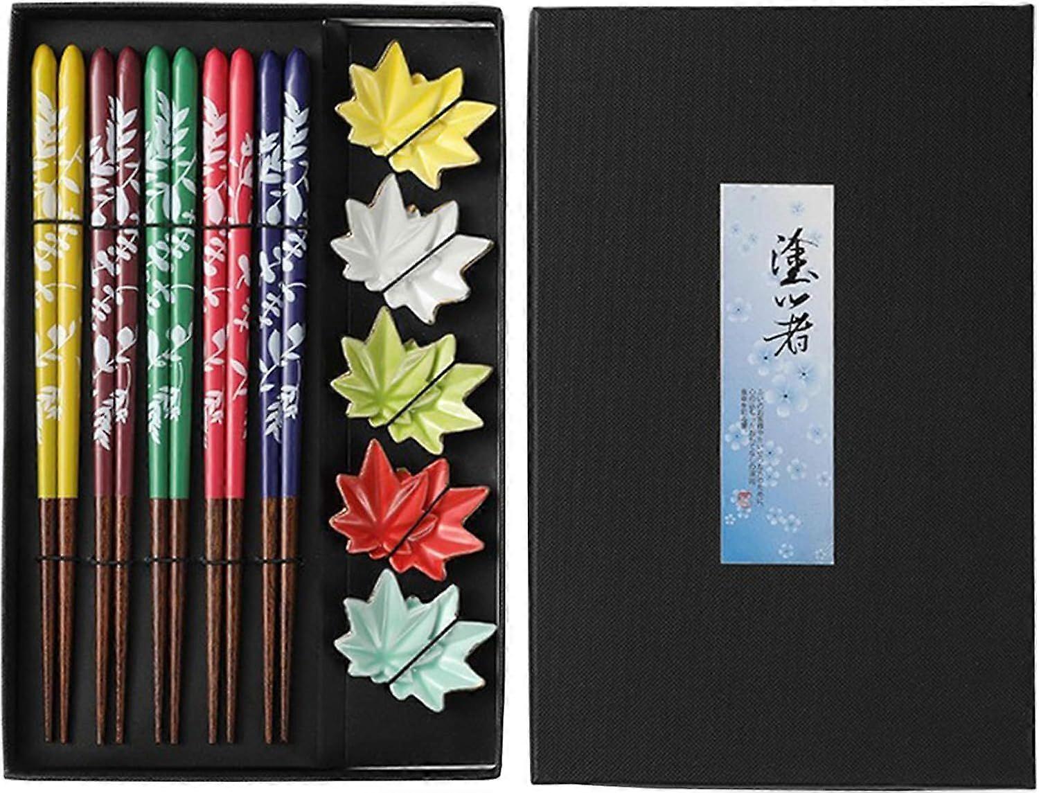 5 Pairs Wooden Chopsticks with Chopsticks Shelves, Sushi Chopsticks Set Maple Leaf Chopsticks with Gift Box, Reusable Chopsticks, Asian Cutlery with 5