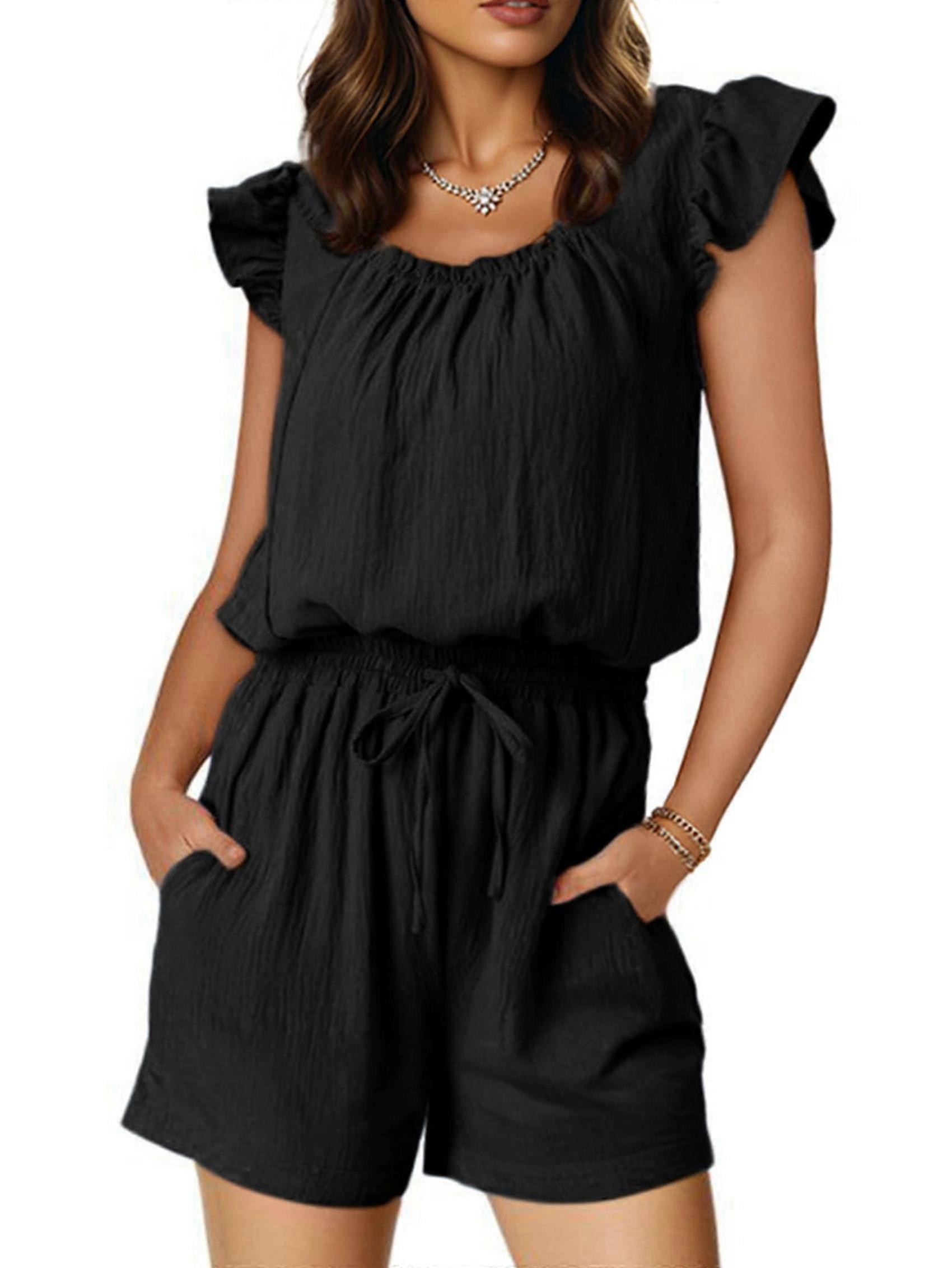 Rompers for Women Summer Ruffle Sleeves Square Neck Drawstring Casual with Pockets Black L