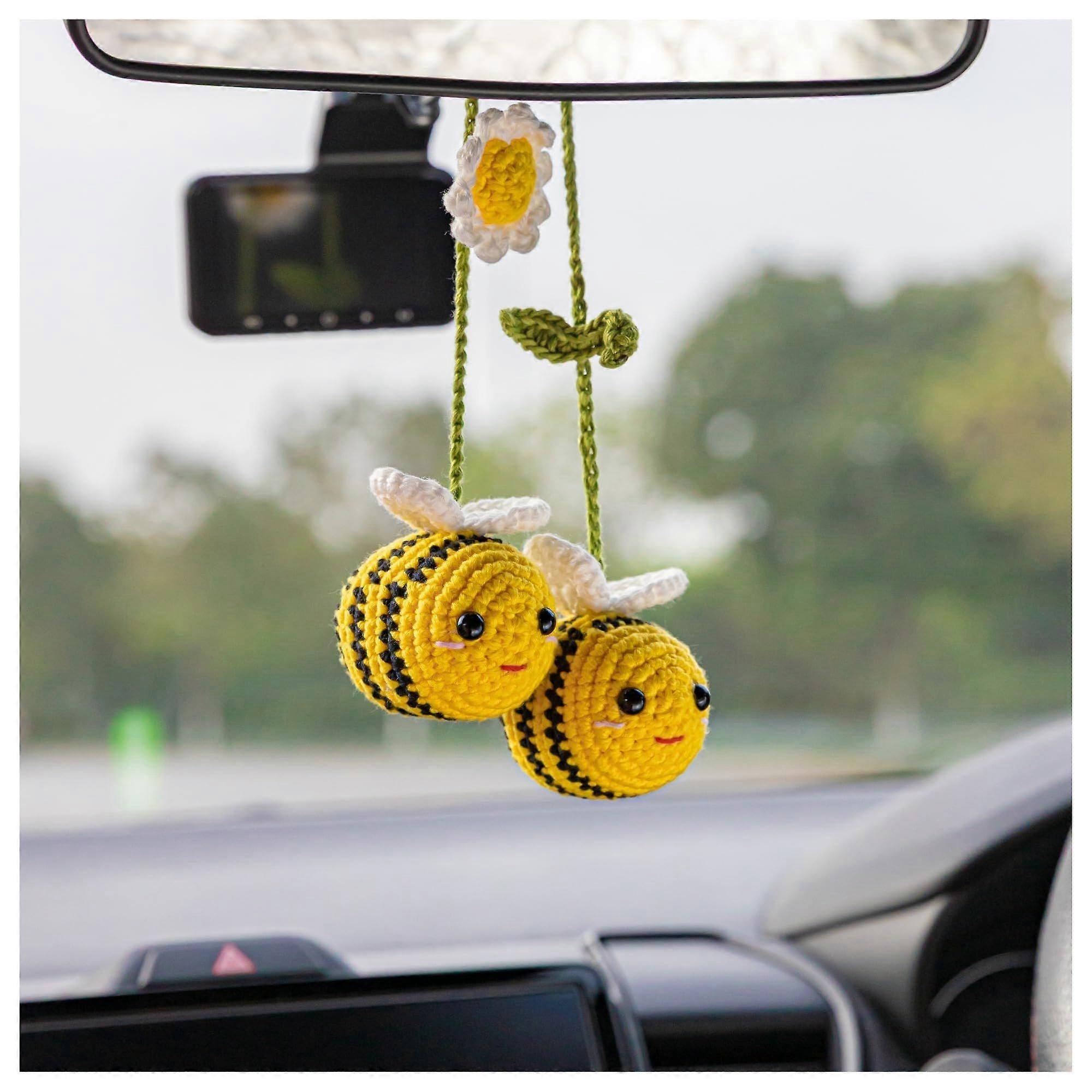 Cute Bee Car Charm Handmade Crochet for Rear View Mirror, Unique Car Accessories for Women and Men, Durable Car Interior Decor
