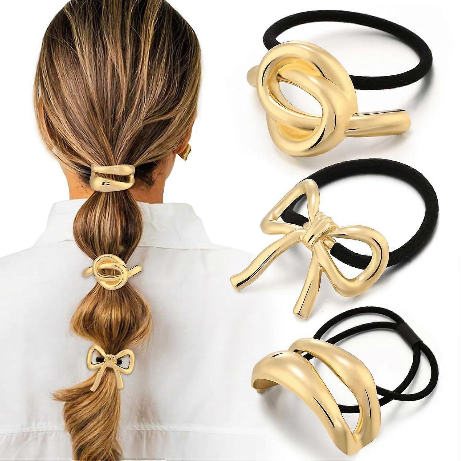 Gold Hair Ties for Women, 3PCS Stretchy Metal Ponytail Cuff Holders - Non-Damage Geometric Hairs Accessories for Thick Hair (3 Styles), Elegant Holida