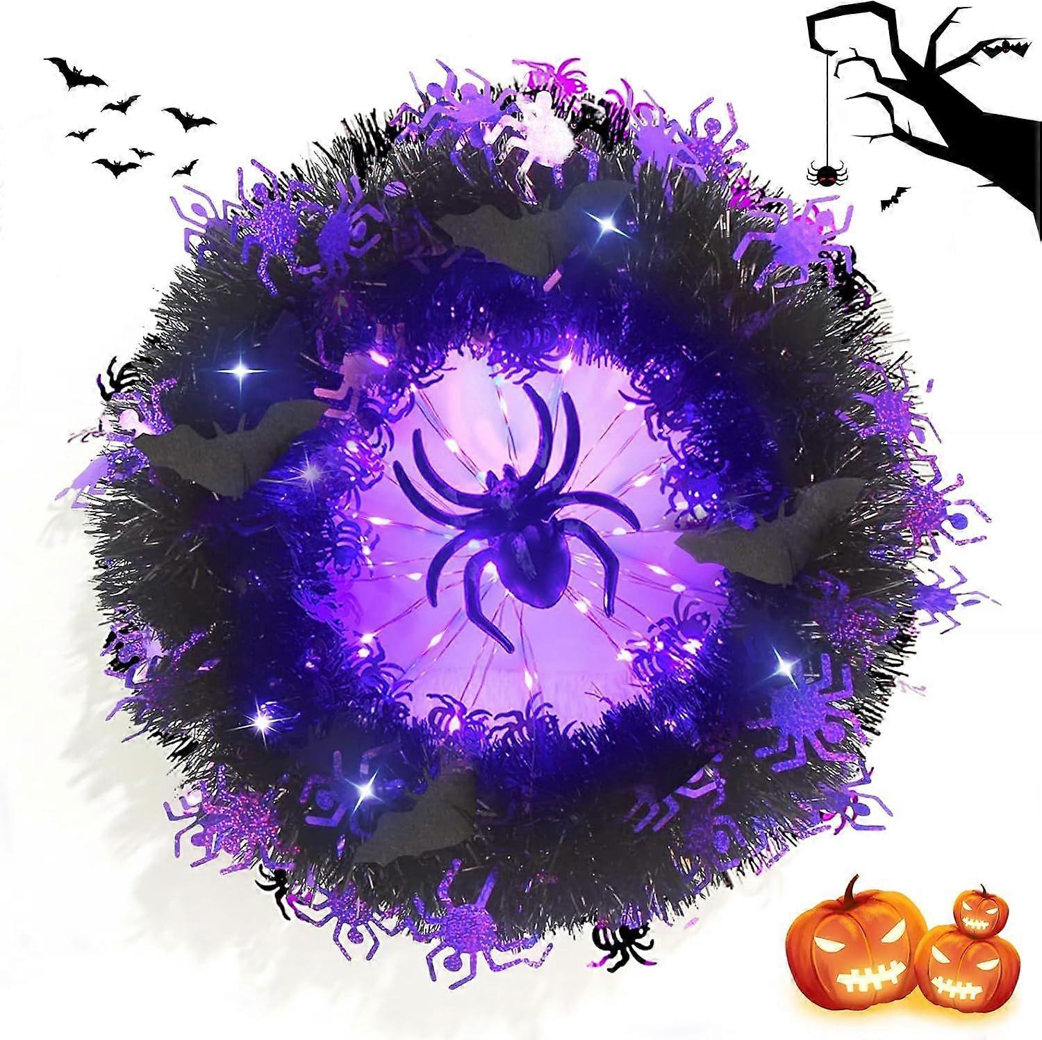 Halloween LED Purple Spider Glow Wreath, Indoor/Outdoor Decor for Front Door, Wall, Porch, Haunted House Horror Party Hanging