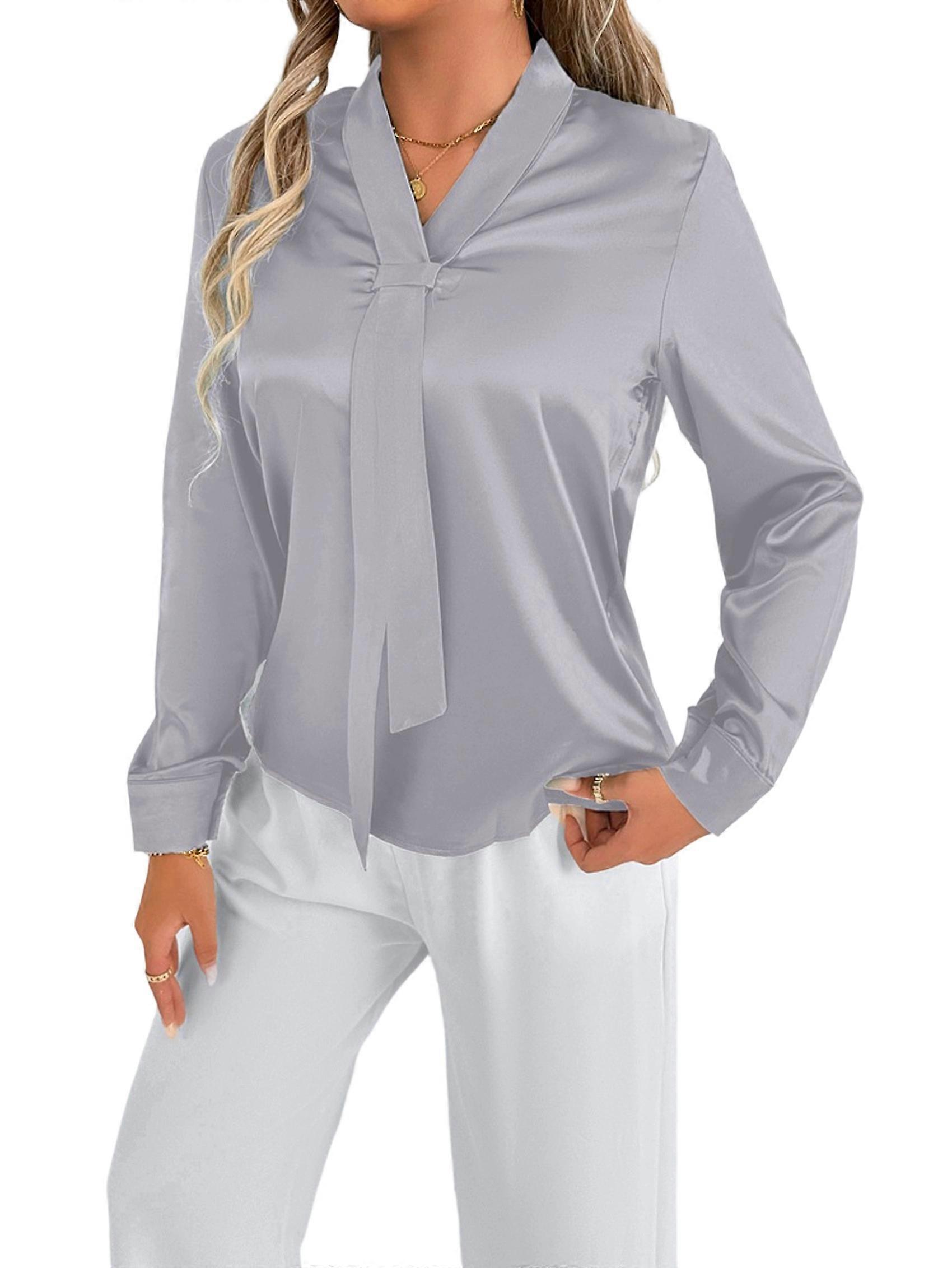 Women'S Summer Satin Blouse Solid Color Long Sleeve Shirt Elegant Casual Office Top Light Gray M