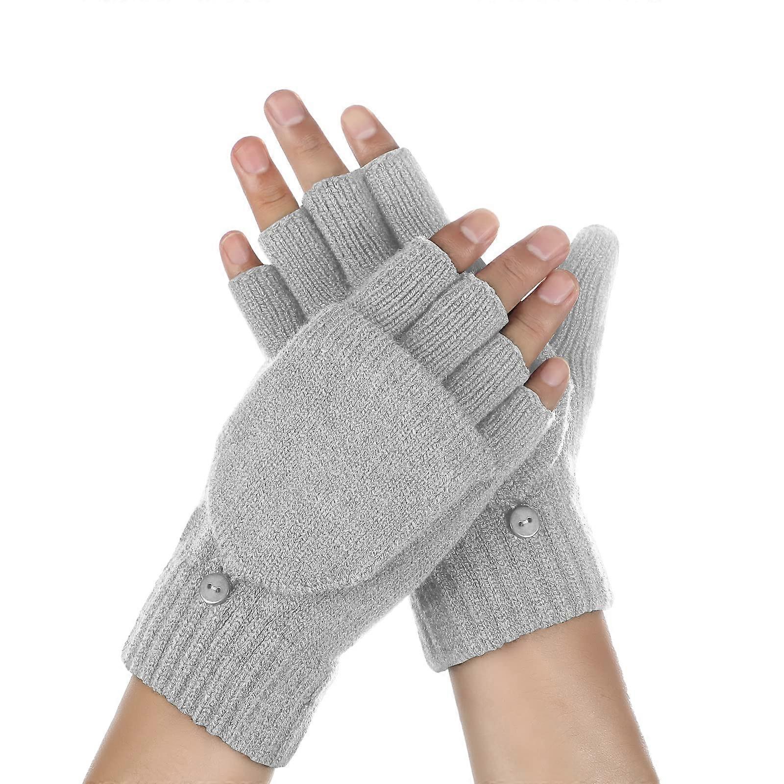 Winter Fingerless Gloves for Men Women, Convertible Warm Half Finger Mitten Gloves Flip Top, Knitted Clamshell Gloves-Grey