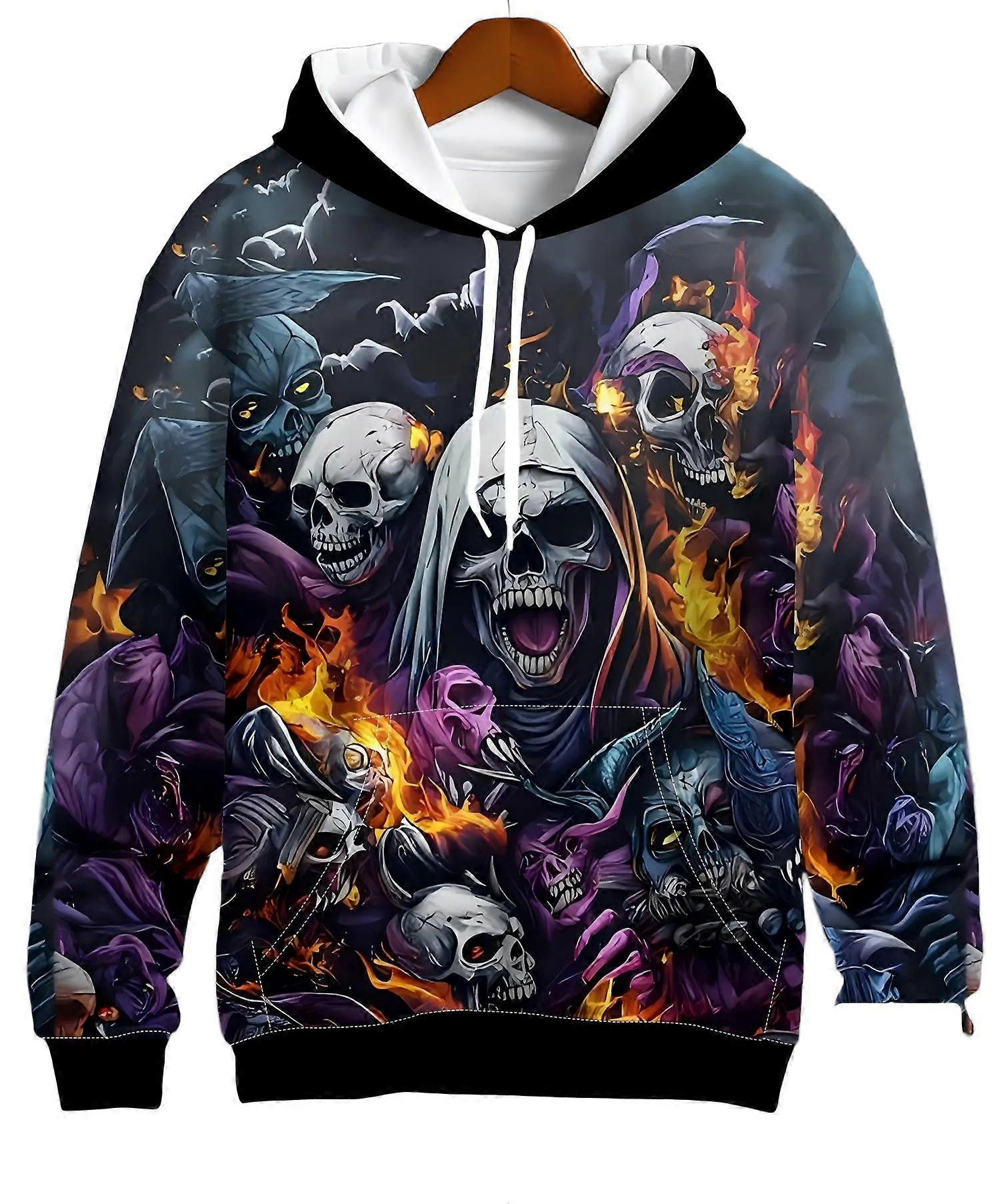 Men’s Spooky Graphic Hoodie Flaming Skull Demon Scene Print Casual Streetwear Pullover