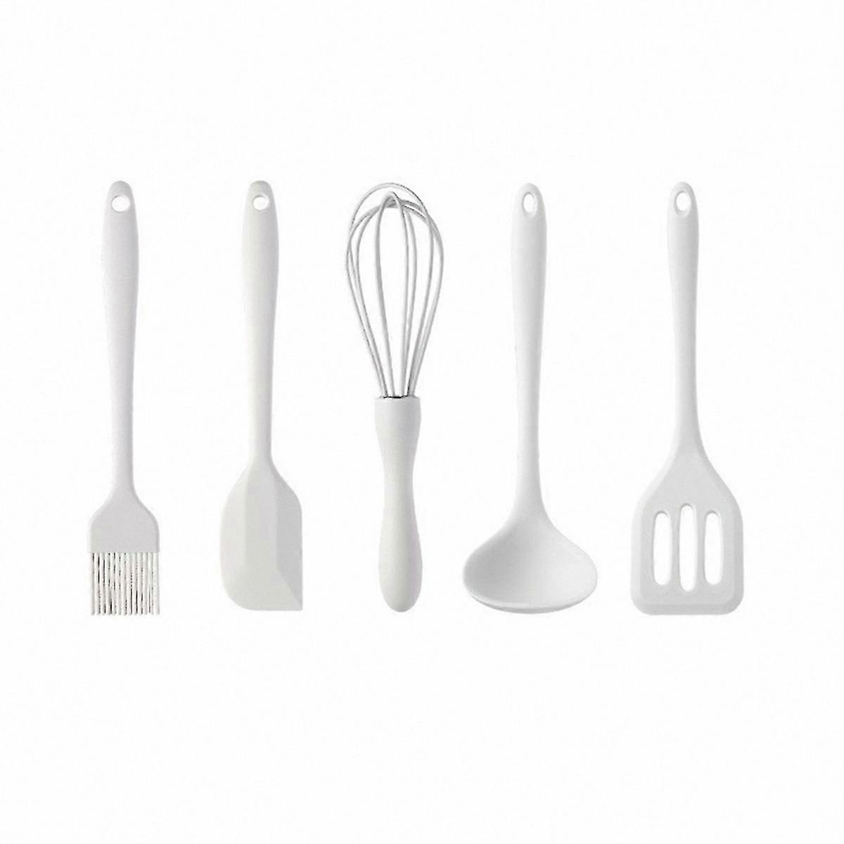 1. Kitchen silicone cookware set. Spatulas and brushes are suitable for cooking and baking. 2. Made from food-grade silicone. Silicone is more durable than wood or stainless steel and resists chipping, warping, and melting. Safe for use with non-stick cookware. 3. Non-slip handle design and easy to clean. Seamless construction prevents food buildup. Dishwasher safe. 4. Includes hanging hole for wall storage—helps save counter space and maintain a clean, sanitary kitchen. Color: White Material: Food-grade silicone Package Contents: 1 x scraper, 1 x oil brush, 1 x spoon, 1 x spatula, 1 x egg beater Note: Color may vary slightly due to screen settings and lighting. Dimensions may vary by ±1–3 cm.