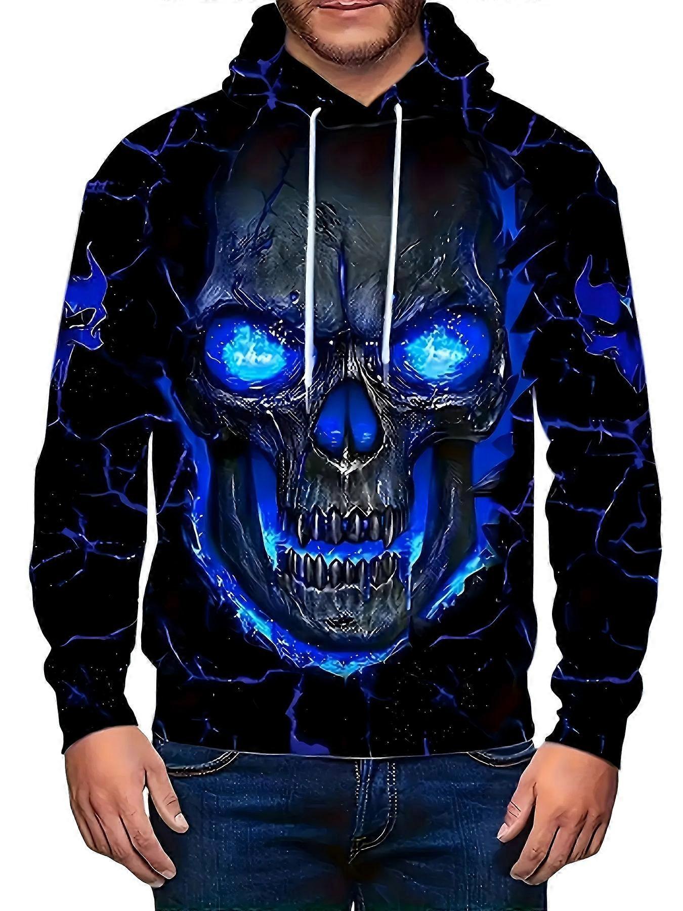 Men’s Fiery Graphic Hoodie Blue Flame Skull Print Casual Streetwear Pullover