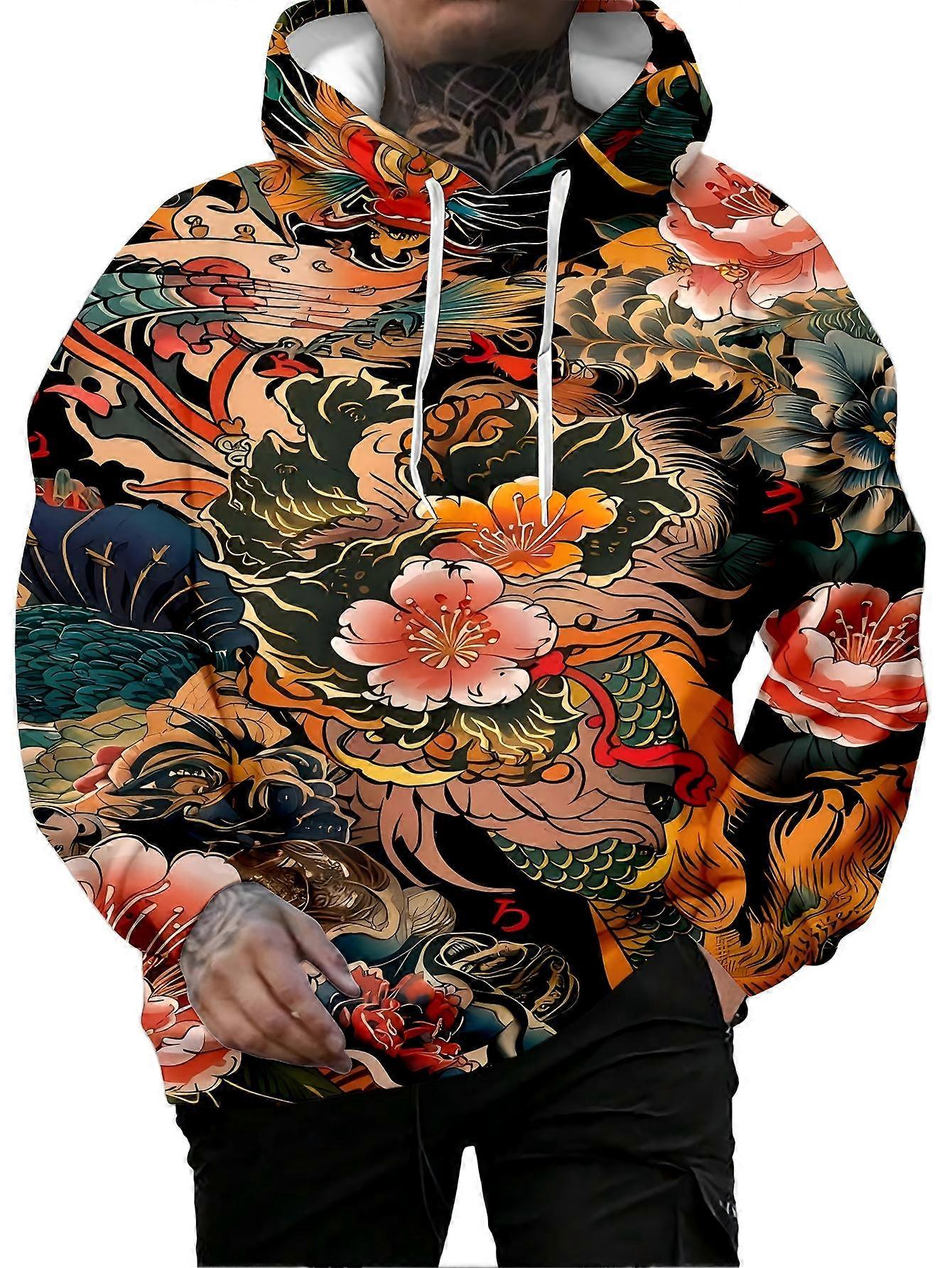 Men’s Artistic Graphic Hoodie Floral Dragon Print Casual Streetwear Pullover