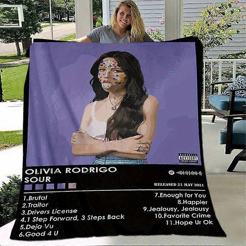 A Single Flannel Blanket Inspired by Olivia Rodrigo Featuring a Purple Flower Design And Crossed Arms from The Album Release