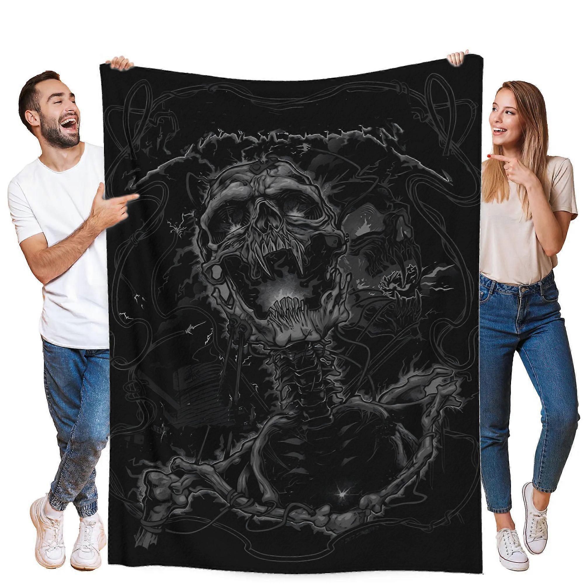 Gothic Skull & Bat Wing Rock Band Design Flannel Blanket Heavy Metal Inspired Black & White Soft All Season Throw for Bed Couch
