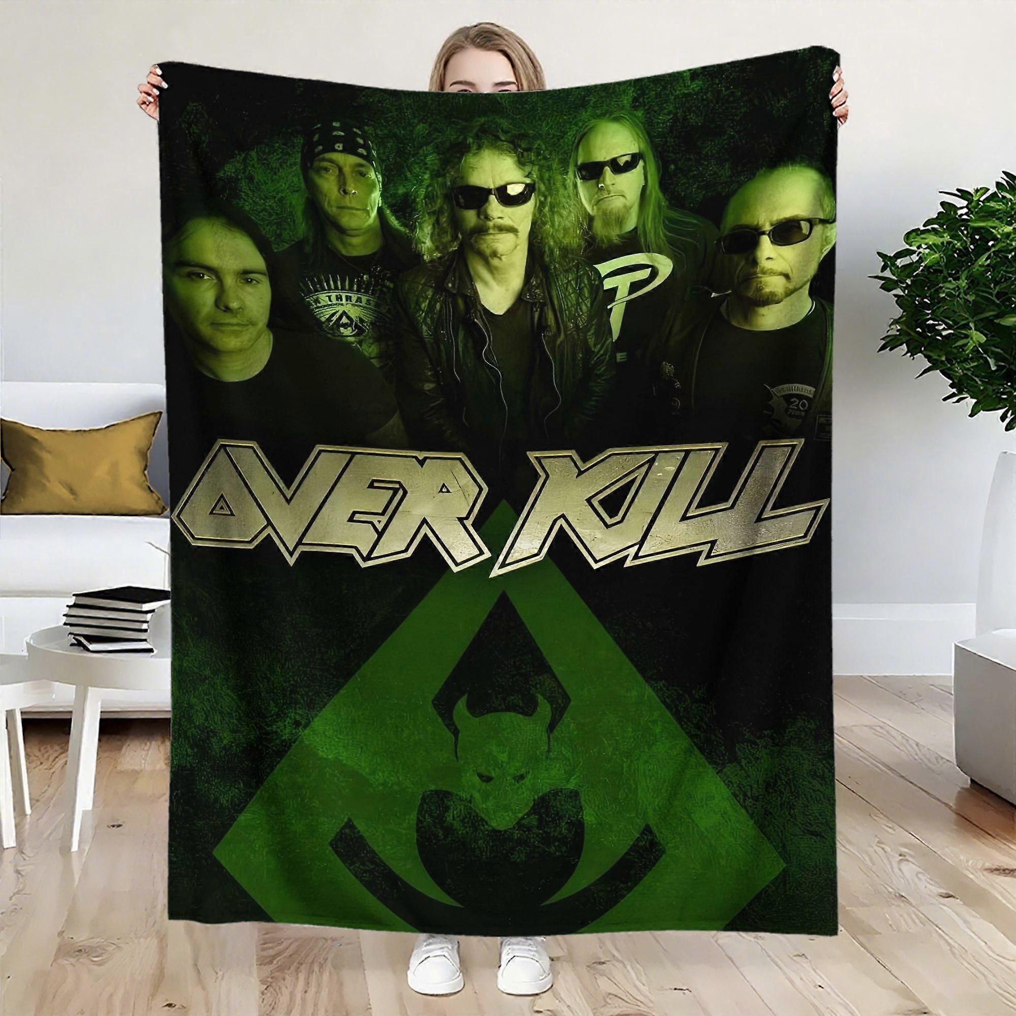 Overkill Band Photo Featuring Green Lighting And Logo. Fleece Blanket Bold And Charming Style Suitable for All Seasons