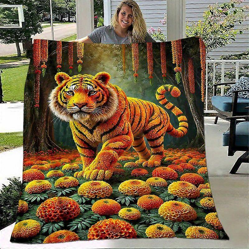 Vintage Cartoon Tiger & Floral Forest Magic Nature Beauty Throw Blanket Soft Flannel