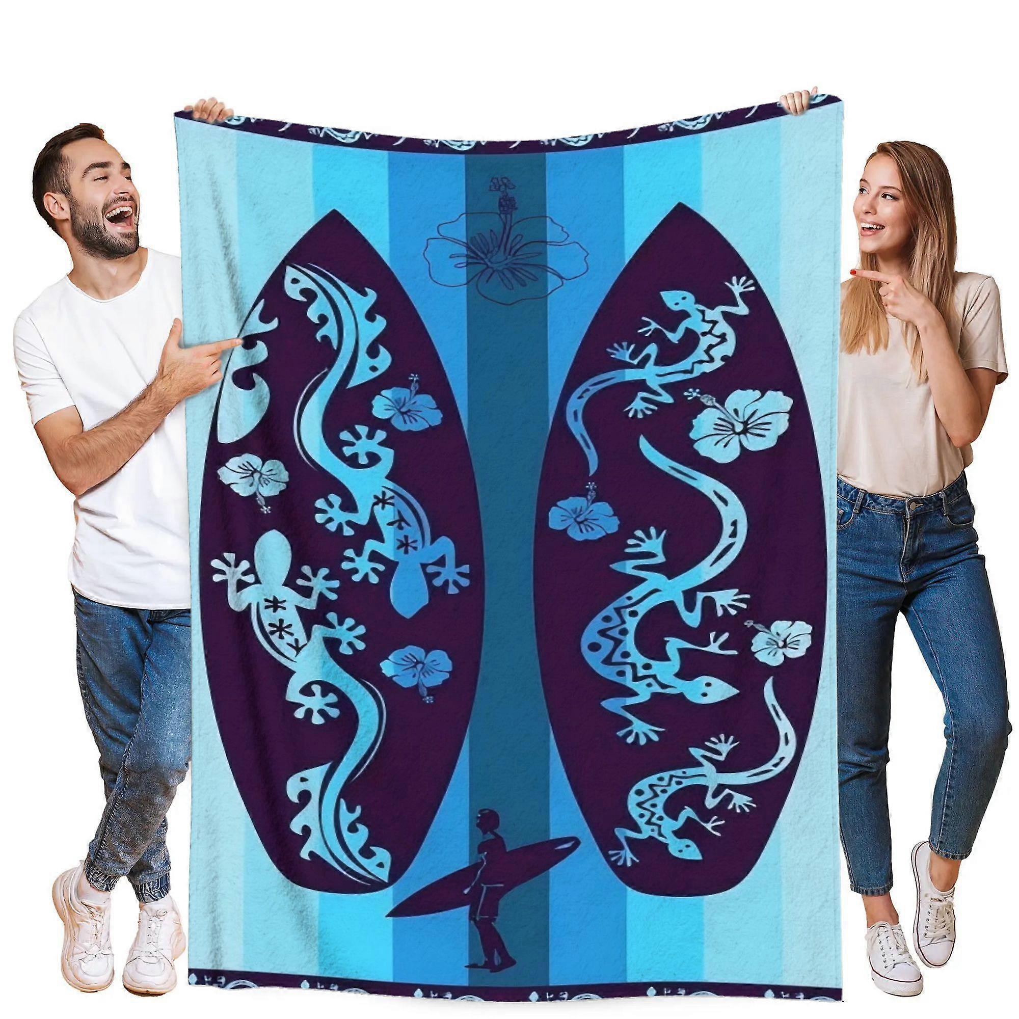 Lizard & Surfboard Design Plush Fleece Blanket Ultra Soft Blue & Purple Lizard Pattern with Surf Motif All Season Cozy Throw for Bed