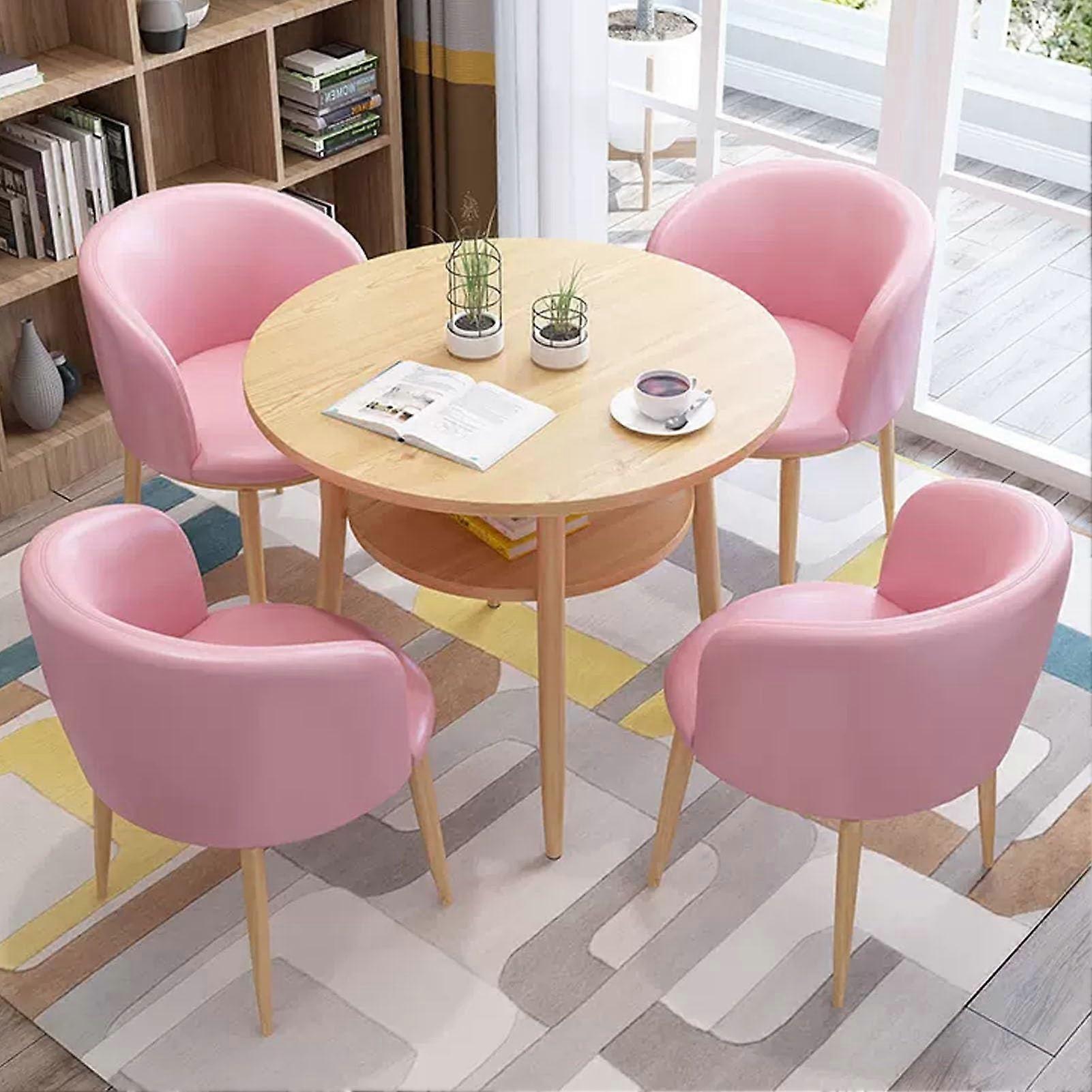Office reception club table and chair set A versatile round table and chair set designed for reception areas, small dining spaces, and compact meeting rooms. The set combines a wooden tabletop, metal legs, and PU leather seats with sponge padding to deliver a functional and comfortable seating solution for four people. Easy to clean and simple to assemble. Key benefits Multiuse functionality: designed for office reception, small kitchen dining, or a compact conference table for up to four people. Easy maintenance: PU leather surfaces are stain resistant and can be wiped clean with a cloth. Comfortable seating: backrest and seat cushions are wrapped with density sponge for resilience and support. Durable construction: solid tabletop, reinforced metal legs, and herringbone leg design with reinforcement discs for stable load bearing. Thoughtful details: rounded tabletop corners and smooth finish on the surface. Product highlights Tabletop: solid wood board plus density board with moistureproof melamine treatment. Rounded tabletop edges for a smooth finish. Chair surface: quality PU leather with clear texture, smooth and wear resistant; seat and backrest padded with density sponge. Legs: table and chair legs made of metal with wood grain paint finish; reinforced leg design for improved stability. Finish and feel: PU leather is soft and padded with full cushions that conform to the body for comfortable seating. Specifications Product name: office reception club table and chair set Colors available: Yellow, Light green, Purple, Brown, Red, Dark green Table shape: round Table material: wooden tabletop Table and chair leg material: metal Chair material: PU leather and sponge Table diameter: 80 cm / 31.5 in Table height: 74 cm / 29.1 in Chair total height: 78 cm / 30.7 in Applicable number of people: 4 people Packing method: assembly Packing list 1 table 4 chairs Suggested use scenarios Office reception area: create a welcoming conversation area for visitors and small meetings. Home kitchen or dining nook: compact round table suitable for casual meals and family conversations. Small conference or meeting room: use as a compact meeting table for quick discussions among up to four people. Care and assembly Assembly required. Follow included instructions for straightforward setup. To clean, wipe PU leather surfaces and the tabletop with a damp cloth and then dry with a soft cloth. Avoid abrasive cleaners or sharp tools on the PU leather and tabletop surface to preserve appearance. This set provides a practical, comfortable seating solution for compact spaces while keeping maintenance simple and construction sturdy.