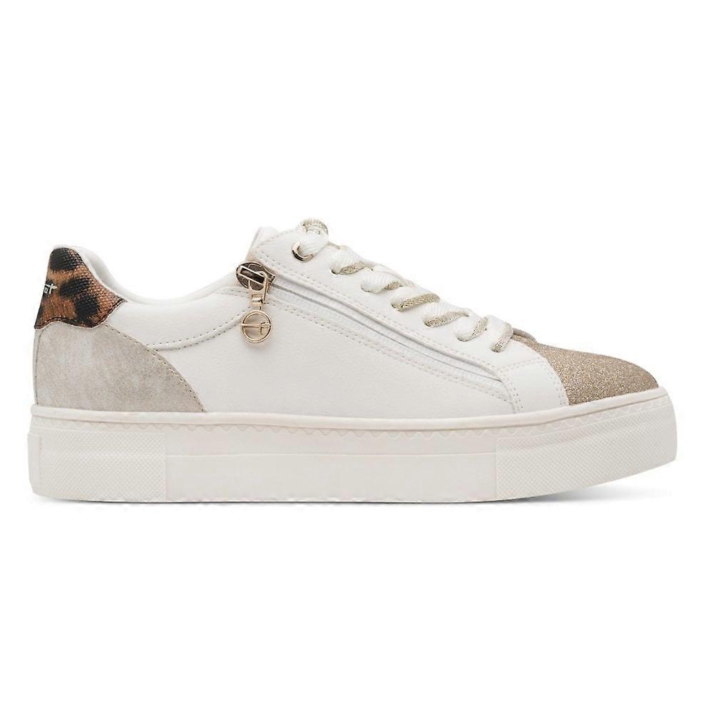 Elevate your casual look with the Tamaris 23313 low platform sneakers in a chic white combi finish, featuring a subtle leopard print detail on the heel for a playful, on-trend twist. These sneakers effortlessly combine modern style with all-day comfort, making them ideal for busy days or relaxed outings. The soft comfort linings and removable insoles keep your feet cushioned and supported, while the 3.5 cm platform sole adds a gentle lift for extra confidence. Designed with a round glitter-finish toe, low-cut shaft, and secure lace-up fastening, they provide a flattering, versatile silhouette that pairs beautifully with jeans, dresses, or casual skirts. Fashion-forward yet comfortable, the Tamaris 23313 White Combi sneakers bring a hint of fun and sophistication to every outfit.Fastening: Lace & Zip Uppers: Synthetic Linings: Textile Insoles: Textile Outsoles: Synthetic Heel Height: 35mm Platform Features: Removable Insoles