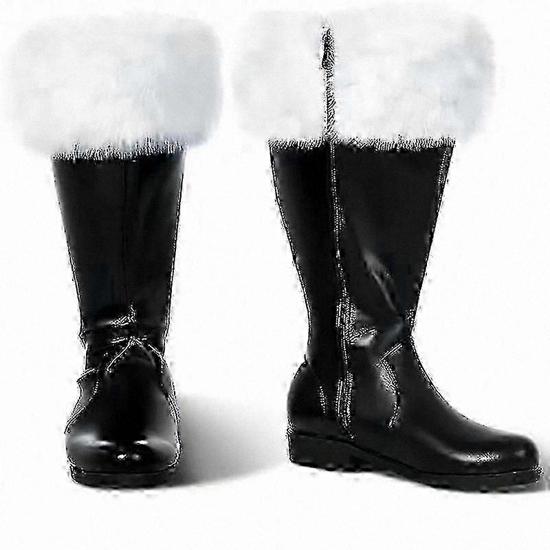 Christmas Santa Claus Boots Cosplay Black Leather Shoes White Plush Cuff, Halloween & Christmas Costume Shoes for Men and Women