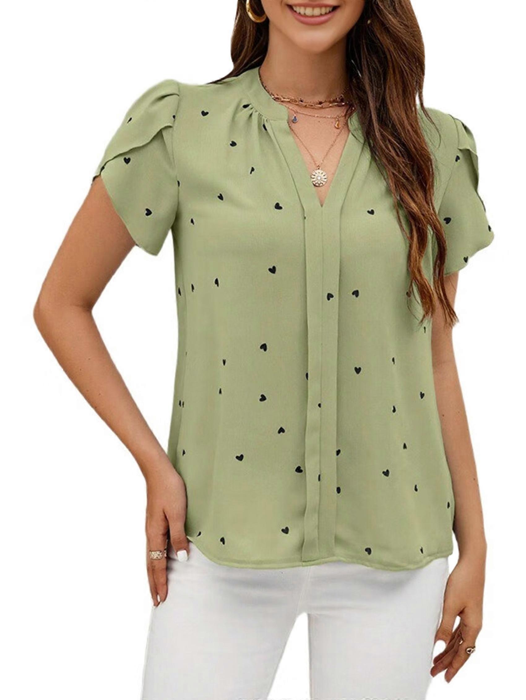 Womens Tops Casual Chiffon Blouses Tops Short Sleeve V Neck Tunic Top Loose Shirt Matcha Green L