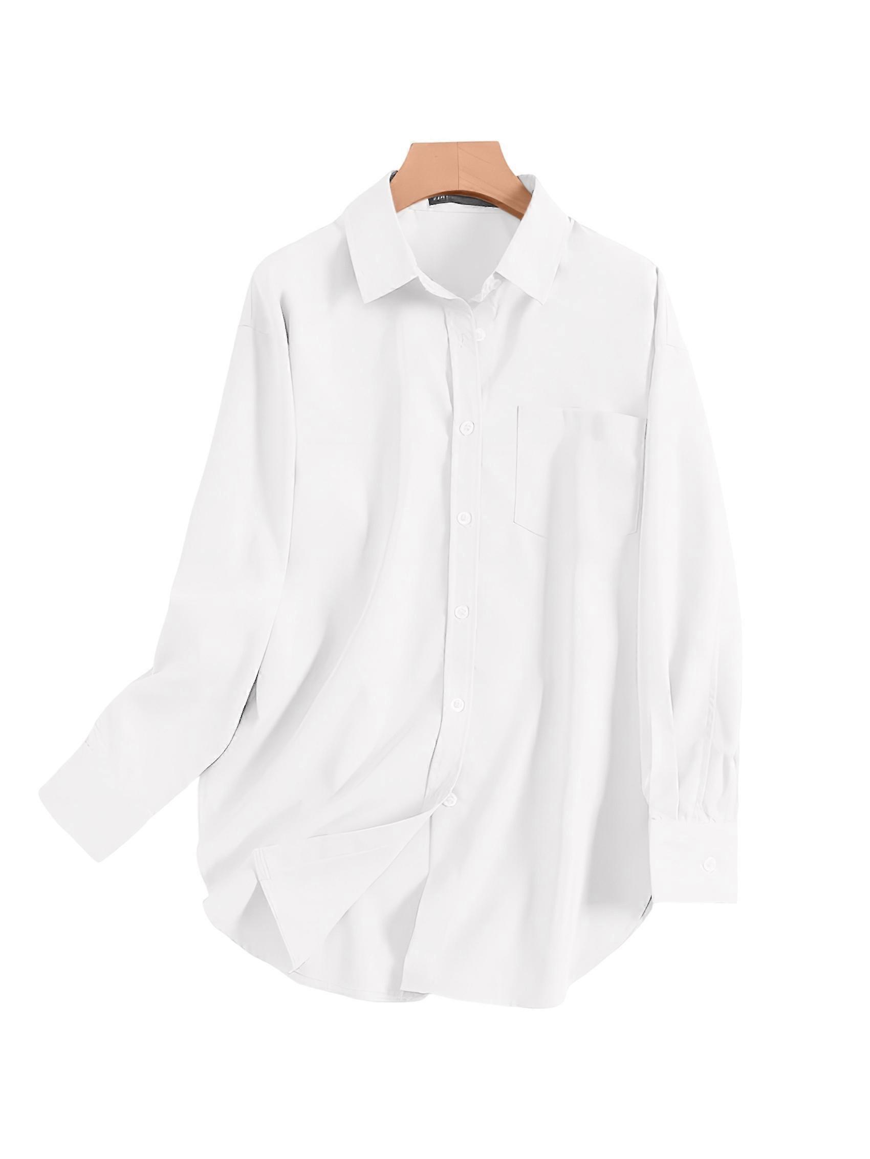 Women'S Elegant Turn Down Collar Long Sleeve Shirt Solid Color Side Slit Hem Office Work Blouse White XXXL