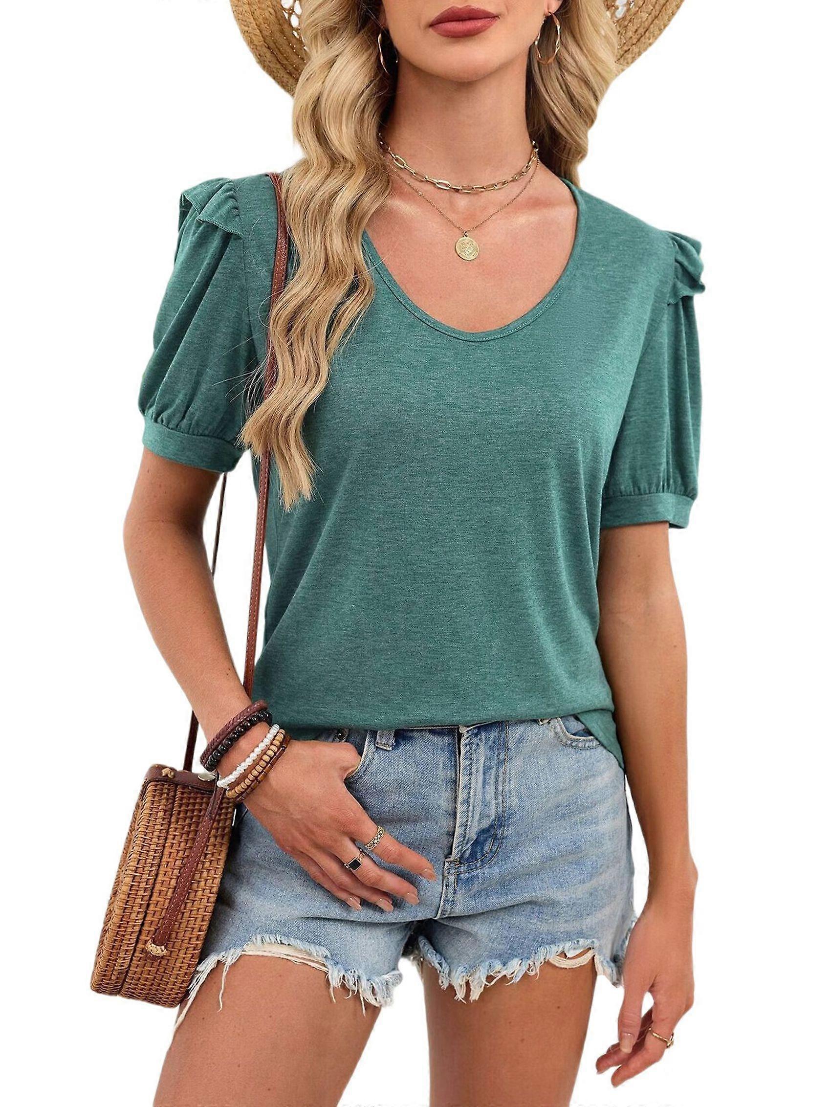 Womens Summer Shirt V Neck Casual Tshirts Puff Sleeve Tops for Women Solid Color XS-3XL Dark Green XL