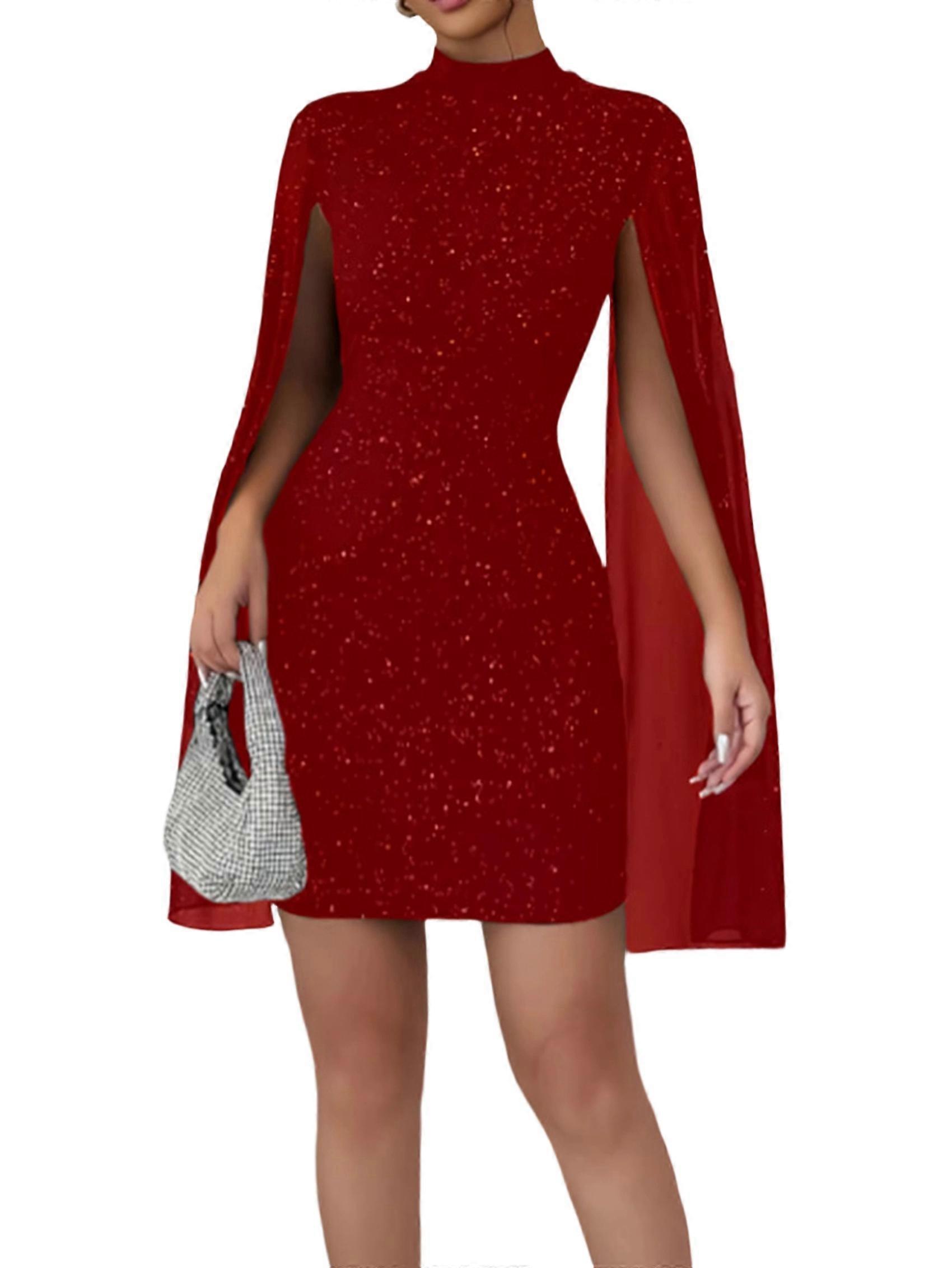 Women'S Elegant Long Sleeve Flutter Sleeve Bodycon Dress with Rhinestone Detail Step Skirt Red XL