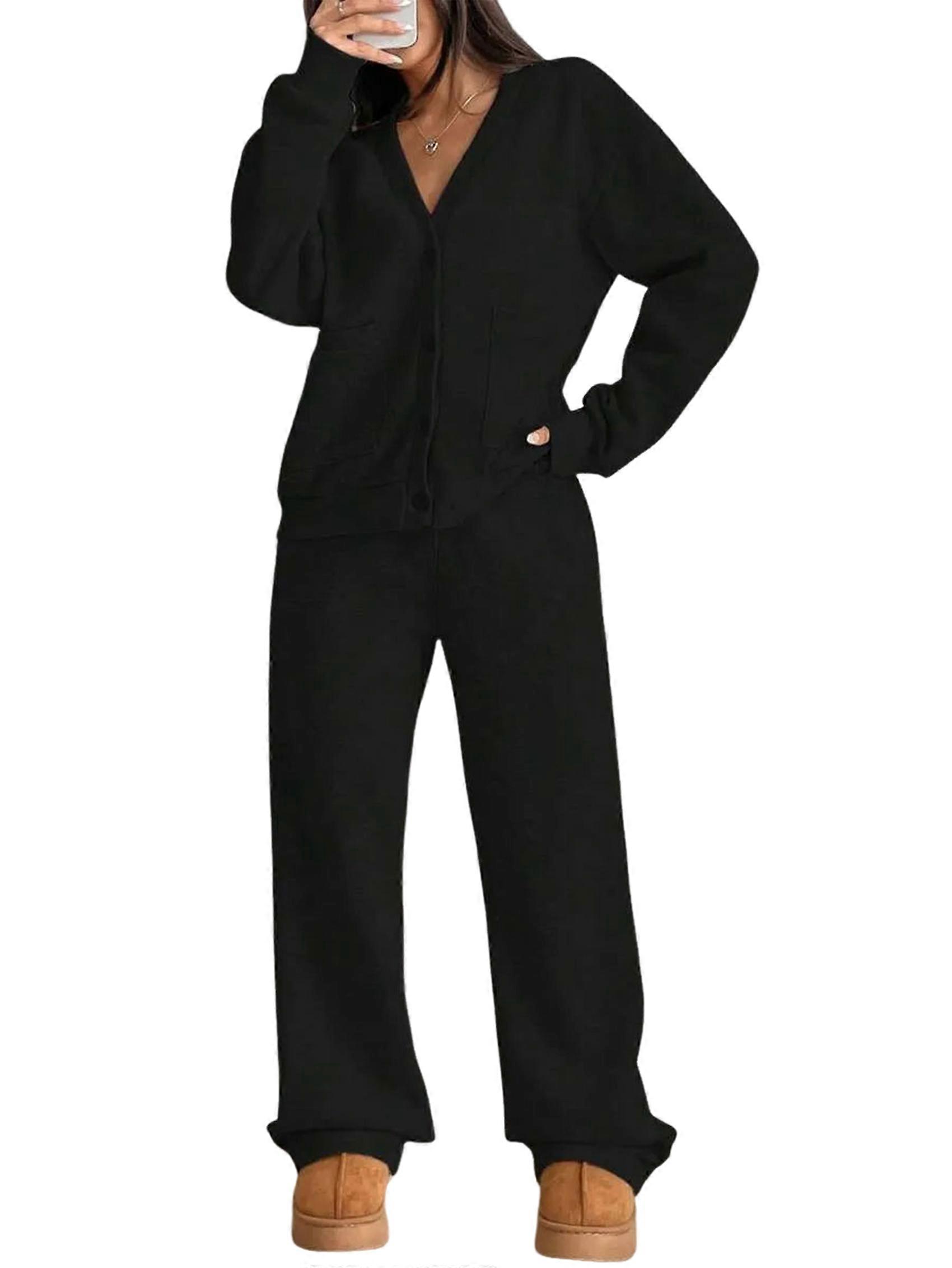 Two Piece Lounge Sets for Women Oversized Button Up Cardigan Wide Leg Pants Matching Loungewear Y2K Clothes Black XXL