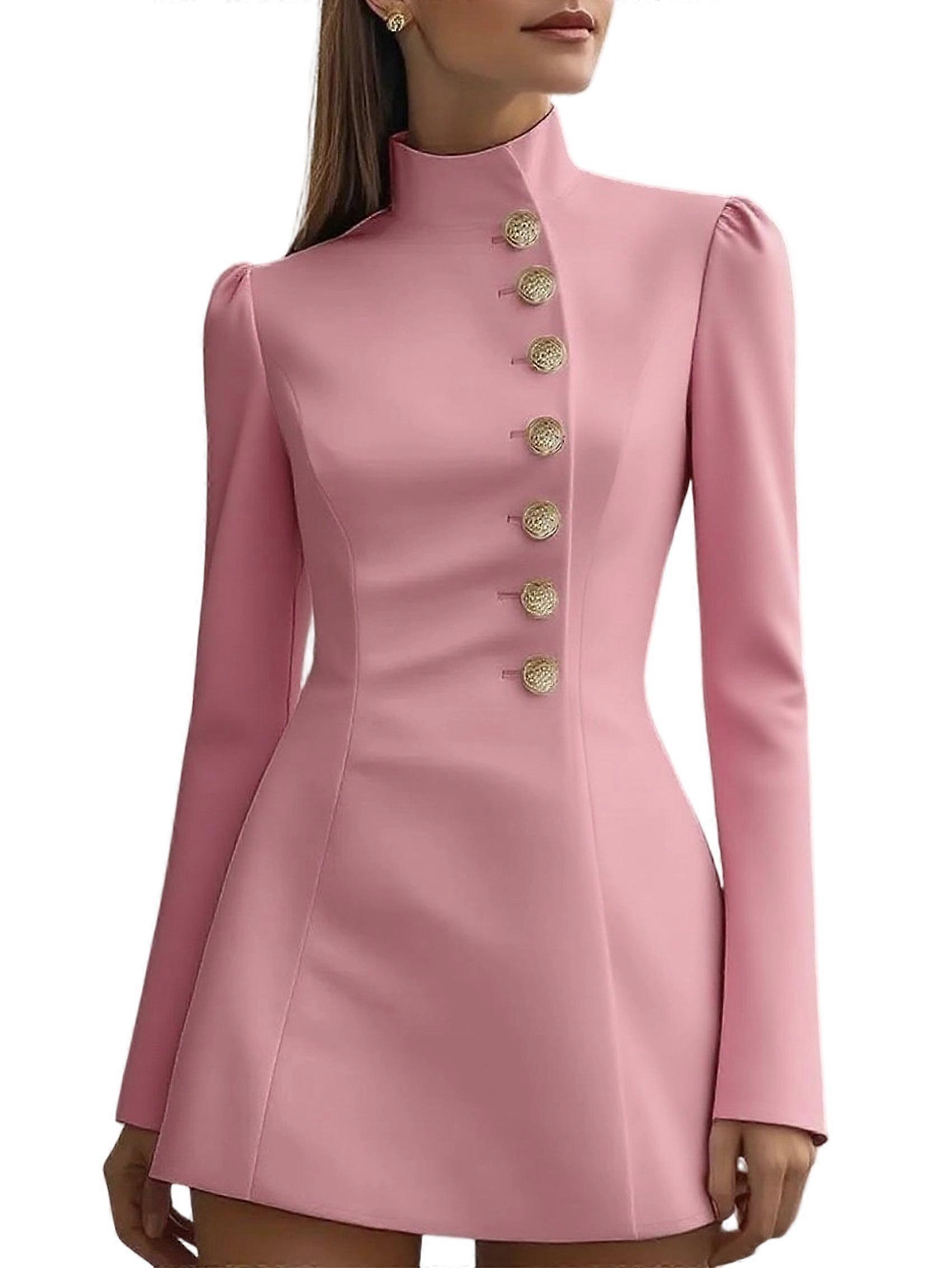 Women'S Slim-Fit Stand Collar Long Sleeves Blazer Dress Business Office Blazer Mini Dresses Pink L