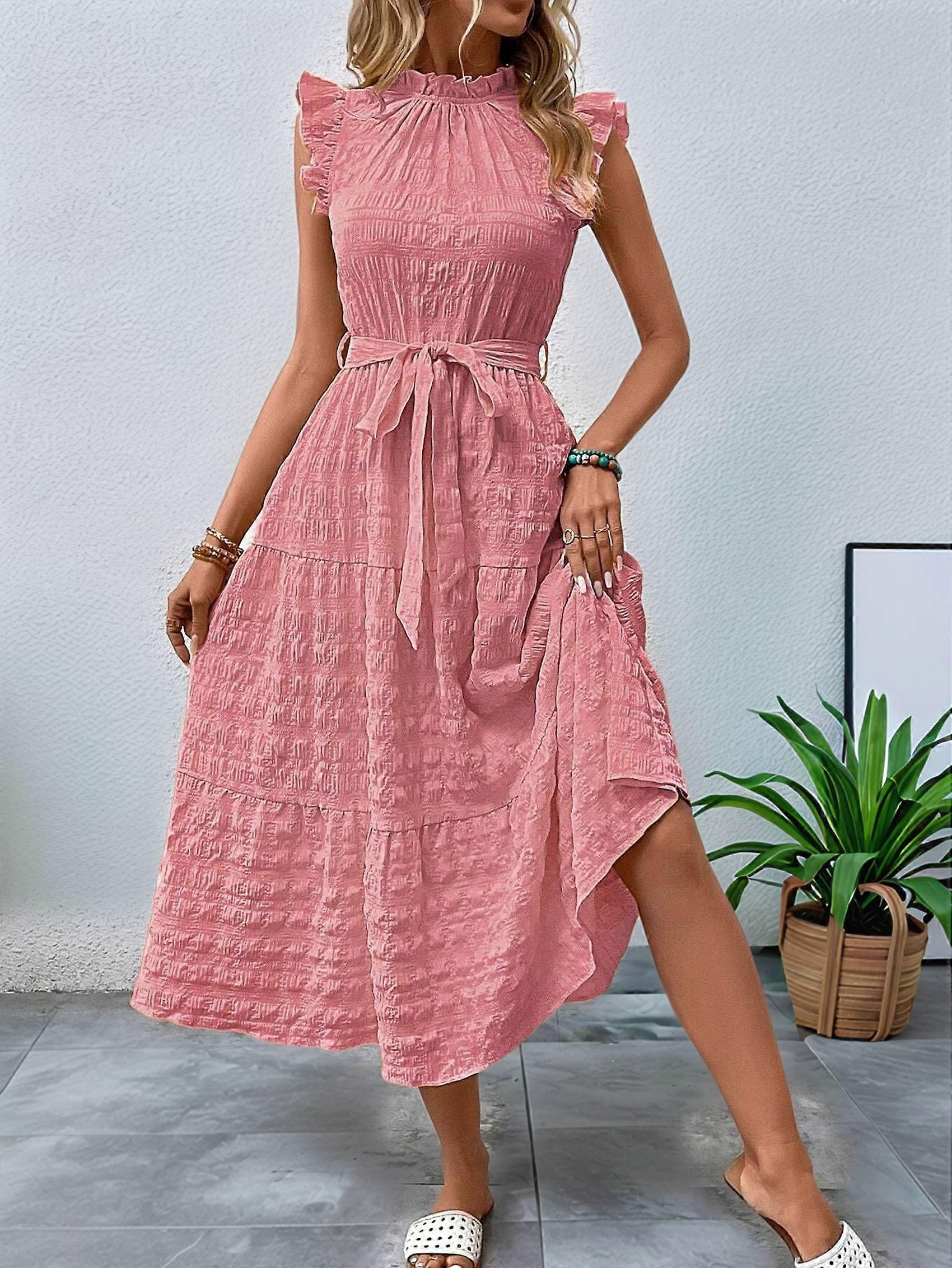 Women'S Ruffle Sleeve Stand Collar Maxi Dress A-Line Hem Ruffled Summer Casual Belted Dress Pink M
