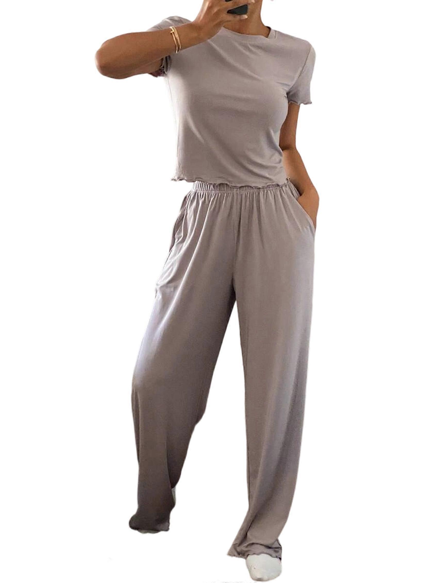 Women'S 2 Piece Pj Set Loungewear Solid Color Wave Trim Decorated Slim-Fit Top and Pants Leisurewear Khaki M