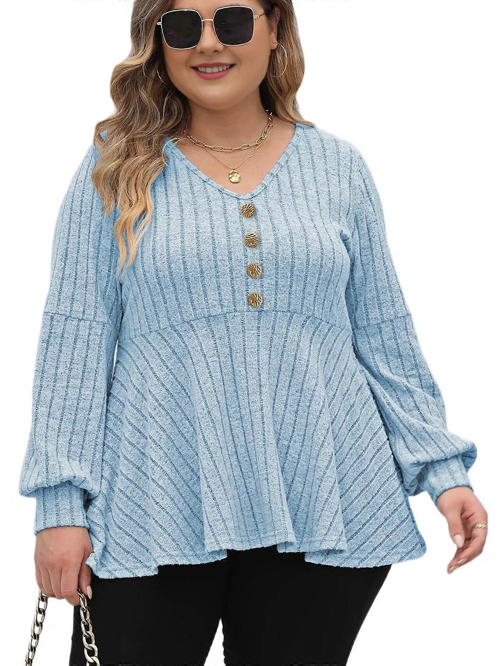Women Plus-Size Dressy V Neck Lantern Long Sleeve Shirts Casual Oversized Tunics Knit Pullover Sweaters Sky Blue XL