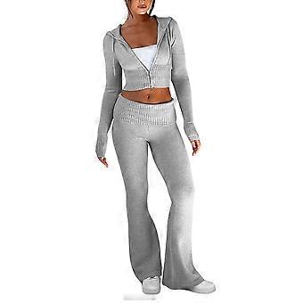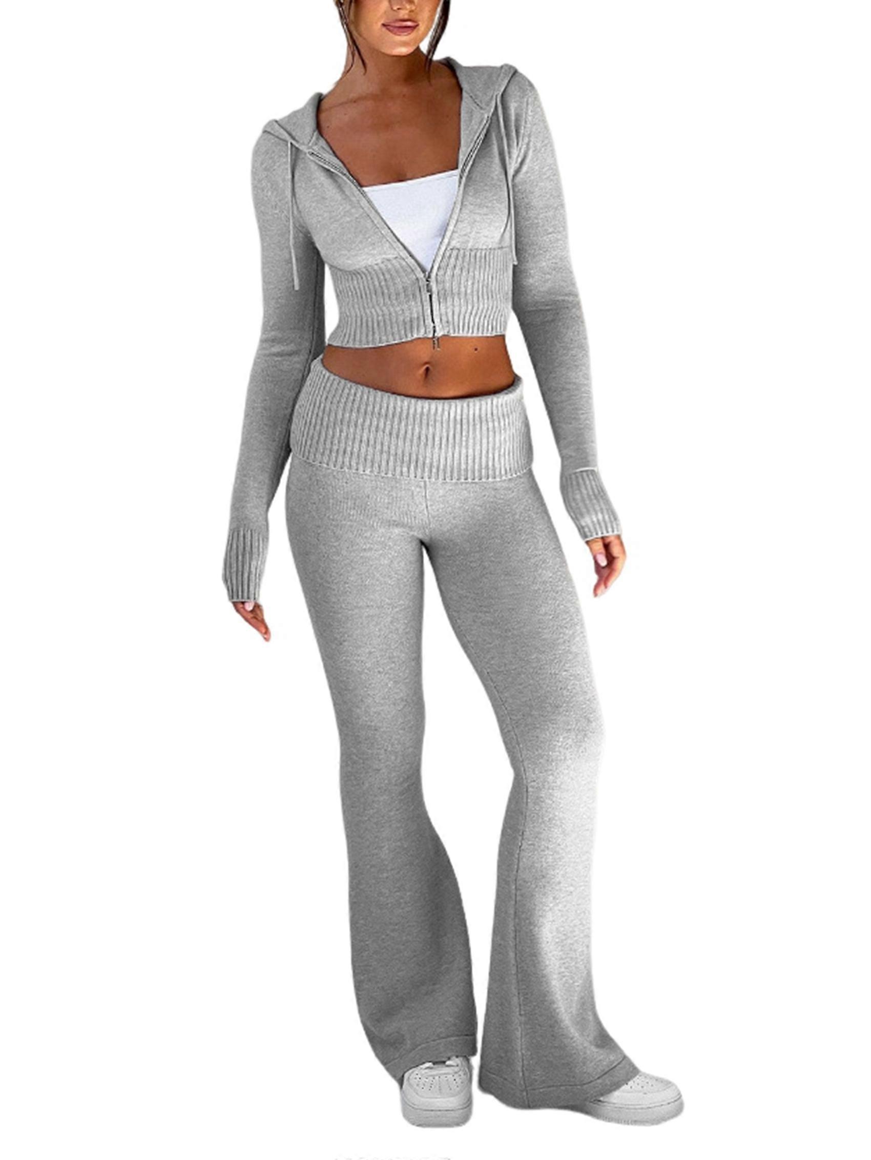 Women 2 Piece Knit Sets Cropped Zip Up Hoodie Foldover Flare Leg Pants Gray S