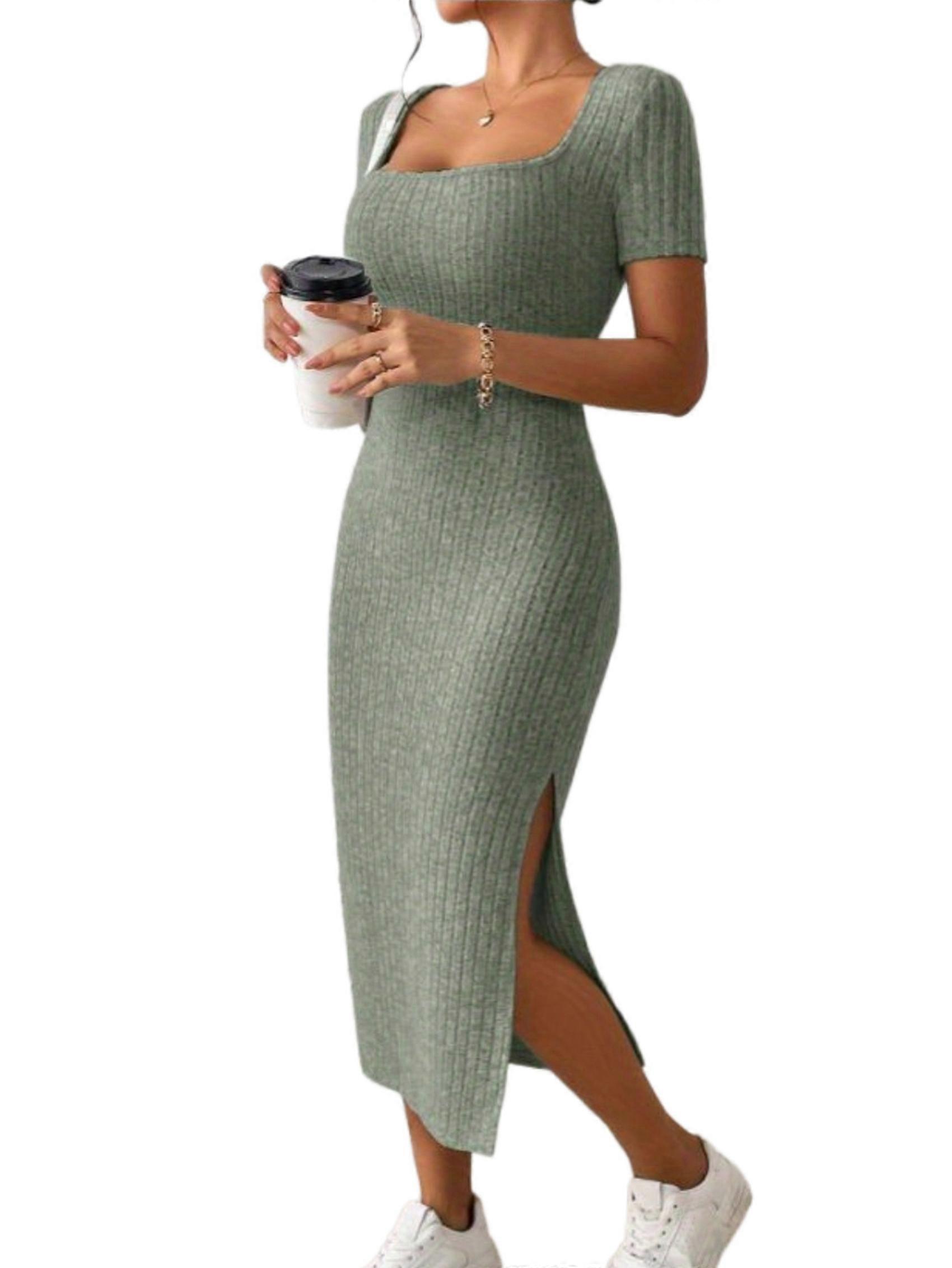 Women Square Neck Casual Summer Ribbed Short Sleeve Bodycon Maxi Dress Side Slit Knit Long Sundress Army Green XL